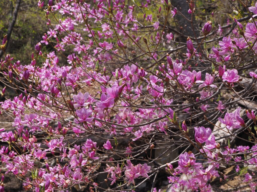 アカヤシオが旬を過ぎ、今度はトウゴクミツバツツジとアズマシャクナゲが次々見頃に入ってきています。