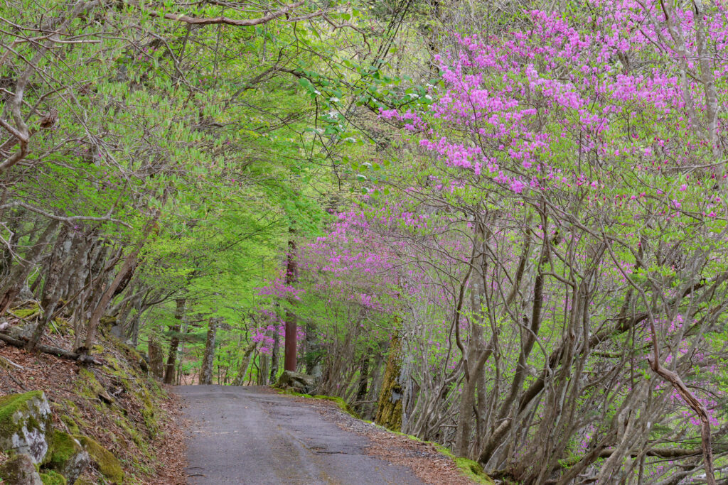 その先の遊歩道沿いでもトウゴクミツバツツジは新緑の森に彩りを与えています。