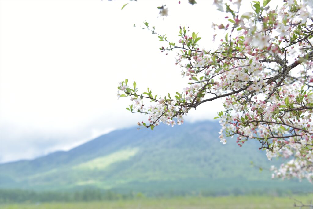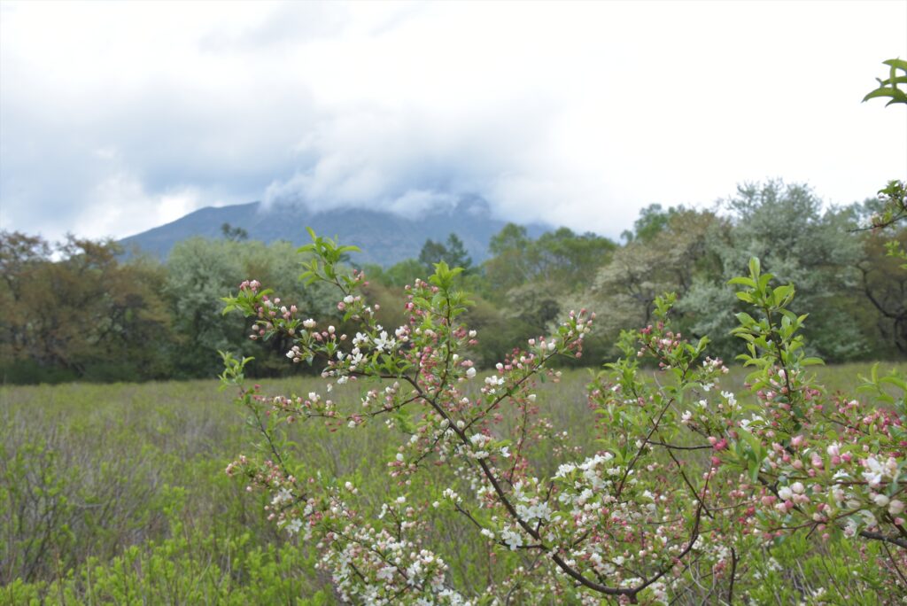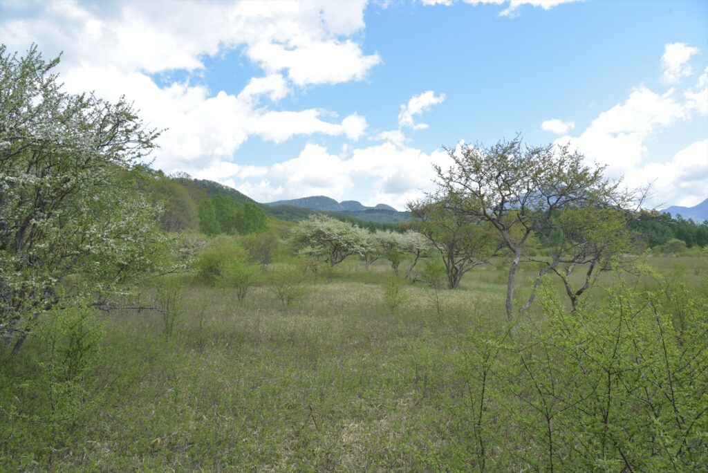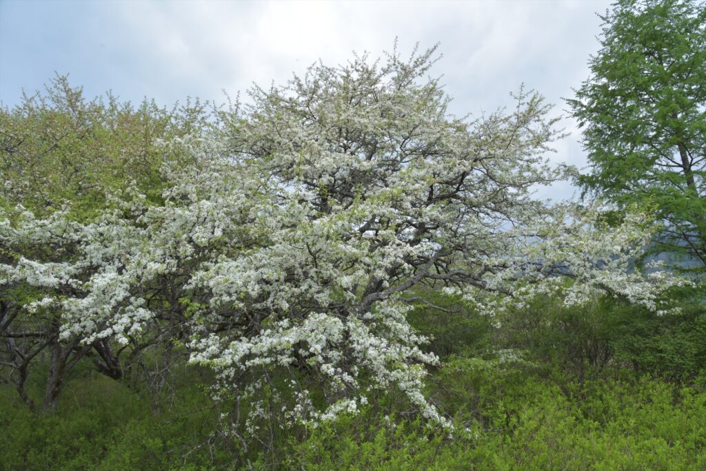 ズミの紅白色を周りではシラカバやカラマツの淡い新緑に包まれている光景は、春らしい柔らかな雰囲気があり、つい見入ってしまうほど癒されました。新緑に映えるズミの紅白色を楽しむには、今がチャンスです。