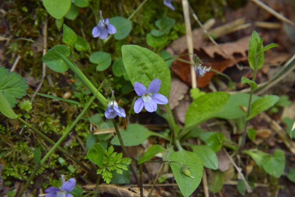 足元では、紫色のスミレ類や白く小さなマイヅルソウ等の花々があちらこちらで咲いています。