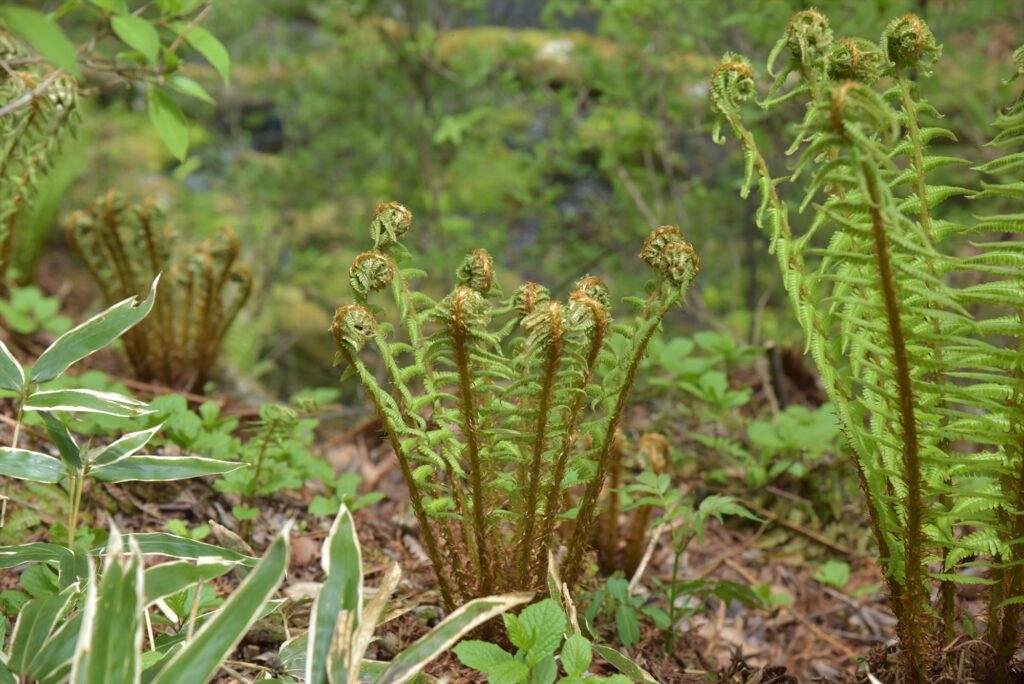 正体は、シダ植物の新芽でした。葉の開き切る前は、内側に綺麗に渦巻くように巻かれていて、遠目から見ると地面からタコの足が出ているように見えました。見た目はかなり奇天烈ですが、触るとまた面白いんです。