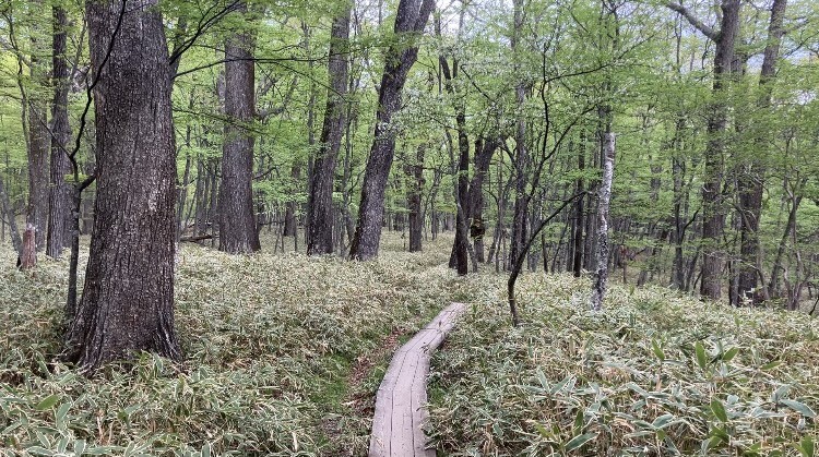 小田代原から泉門池付近ではミズナラが主体の森で、綺麗な淡い新緑に光が差し込む森が広がっていて、