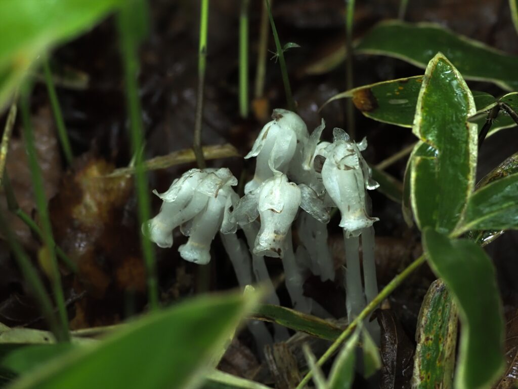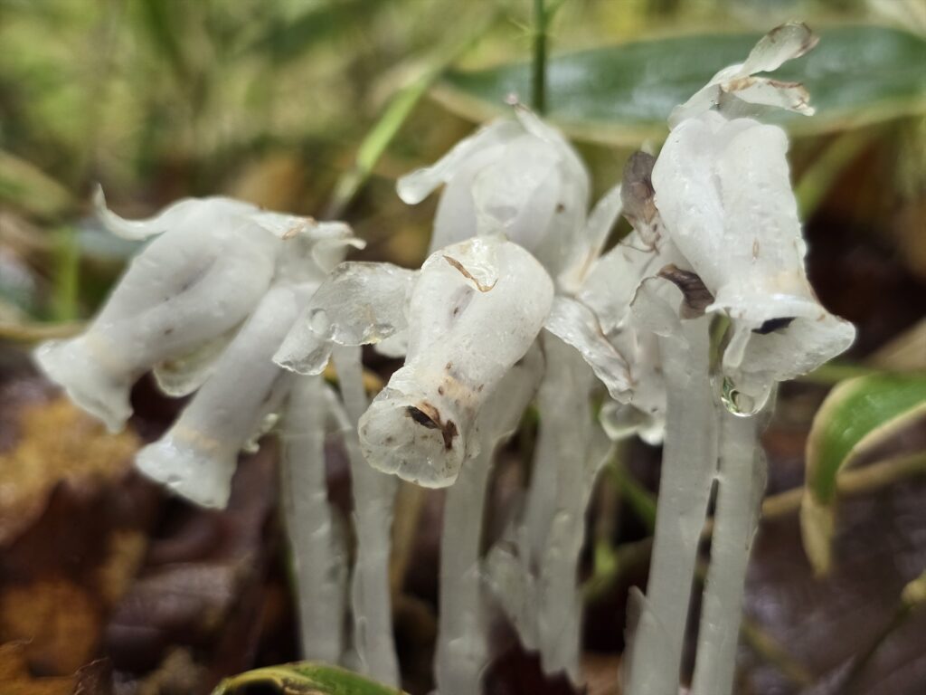 自分で栄養を作らず、ミズナラ等の木の根につく菌類から栄養を貰っています。そのため栄養を作るのに必要な葉緑体を持たず、茎や葉も真っ白なのです。