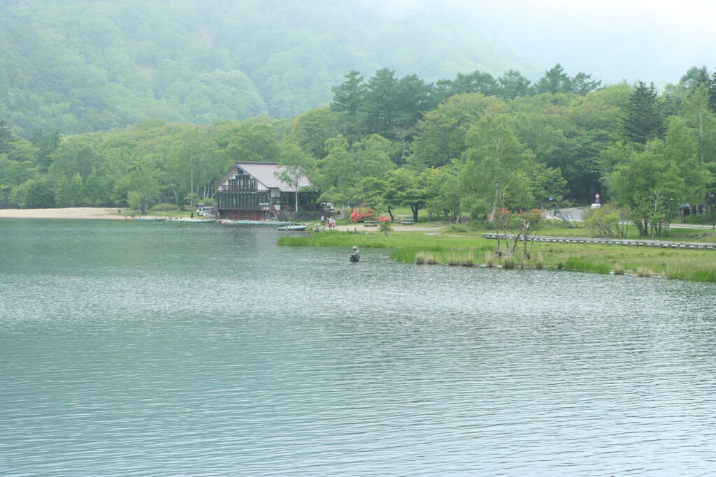 国道側の歩道を少し歩くだけでも深い緑と静かな湖の雰囲気を味わえます。