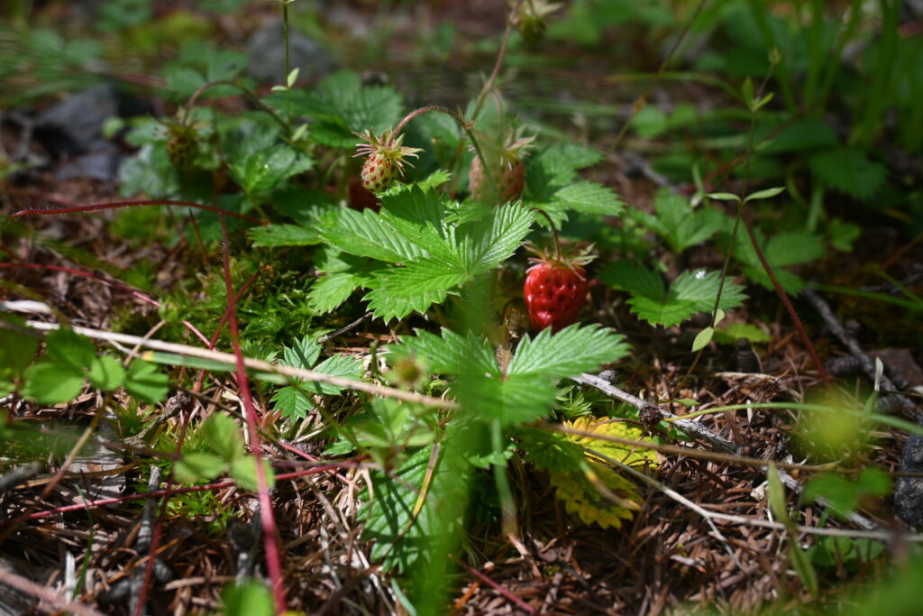 道端には、シロバナノヘビイチゴの実がたくさんありました。直径1cmほどで、とても小さいです。