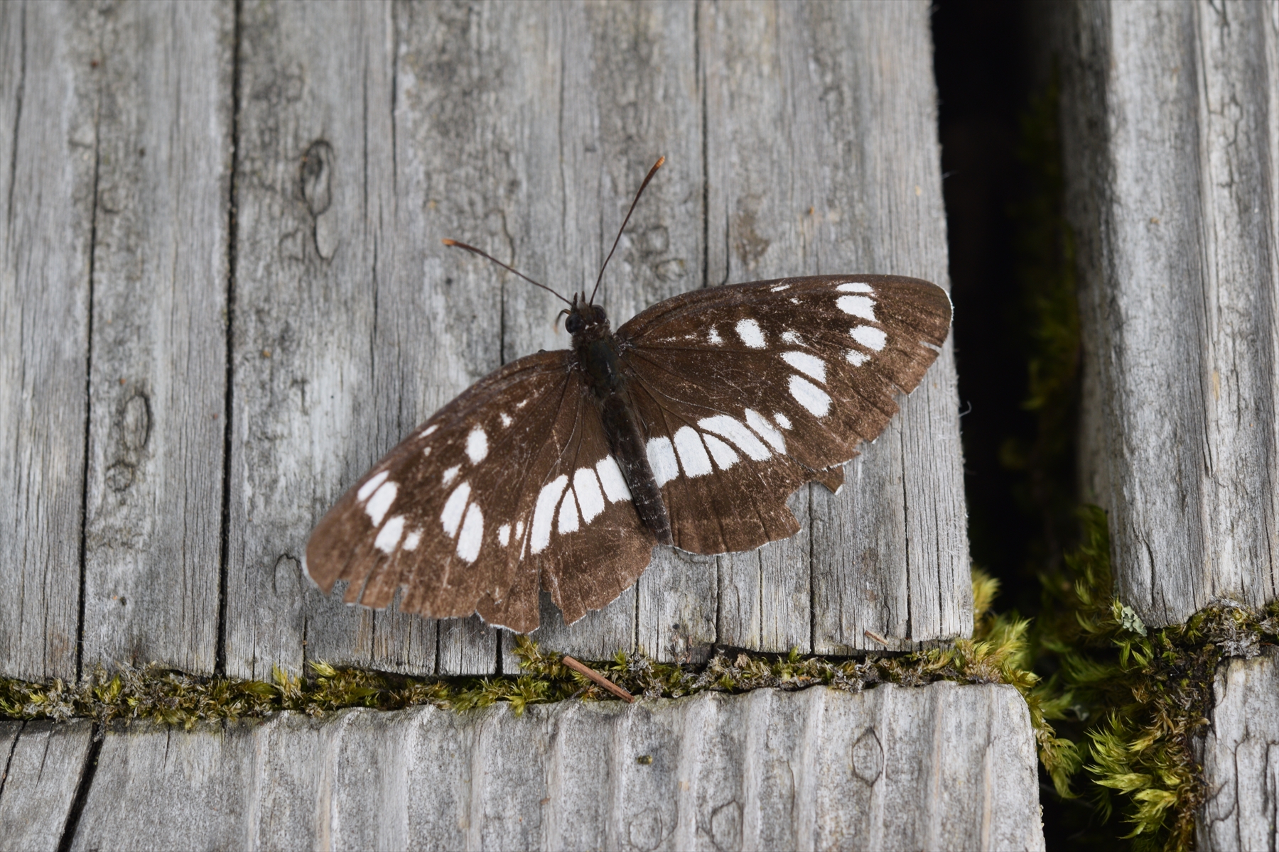 まずはホザキシモツケに集まる、必見のチョウです!黒地に白い斑点模様が筋のようにあるので