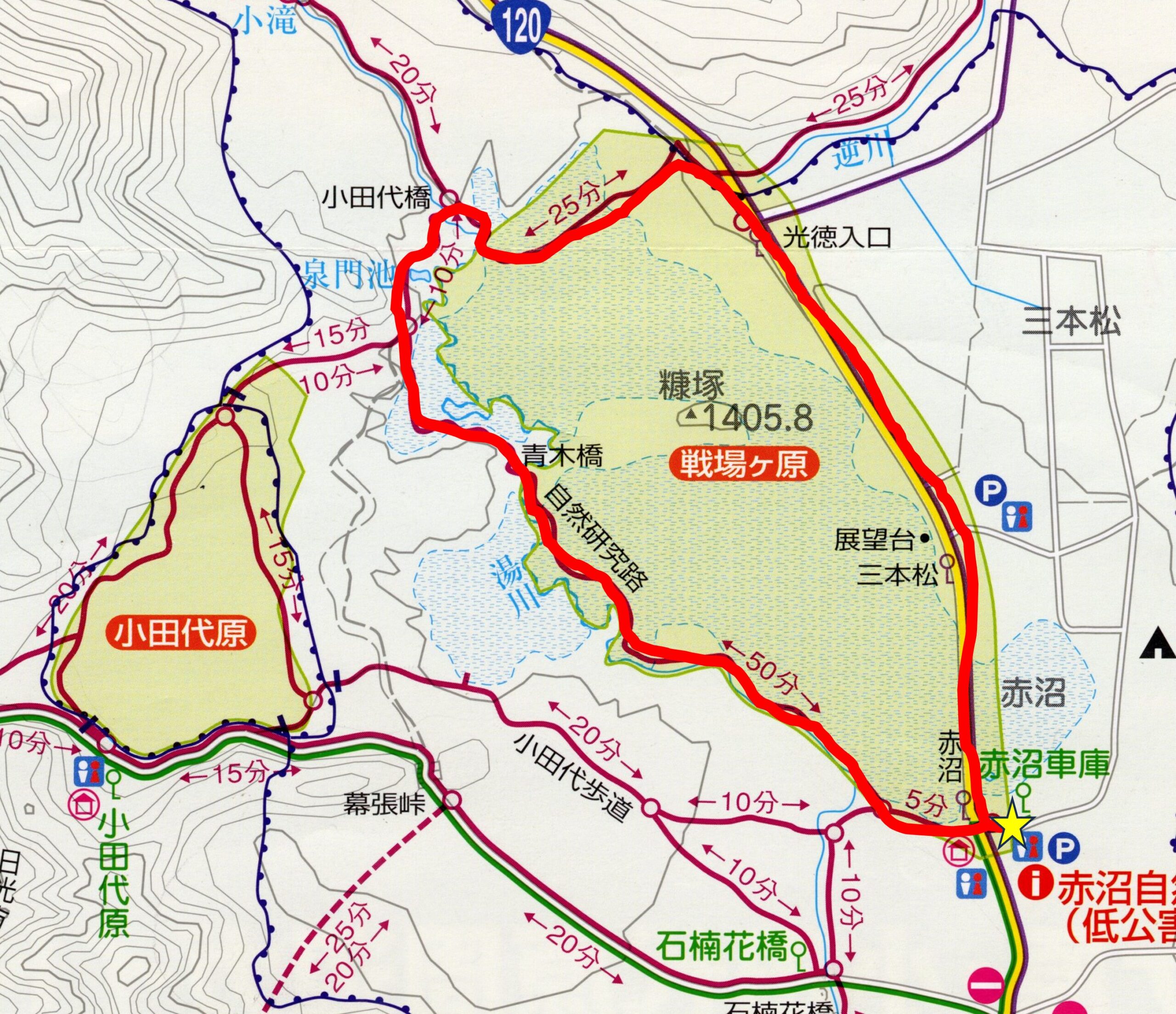 今回は戦場ヶ原をぐるりと歩いてきました。赤沼を出発して湿原の中心部を通り、北戦場、国道沿いを経由して赤沼に戻る一周コースになります。(地図上赤マーカー部)