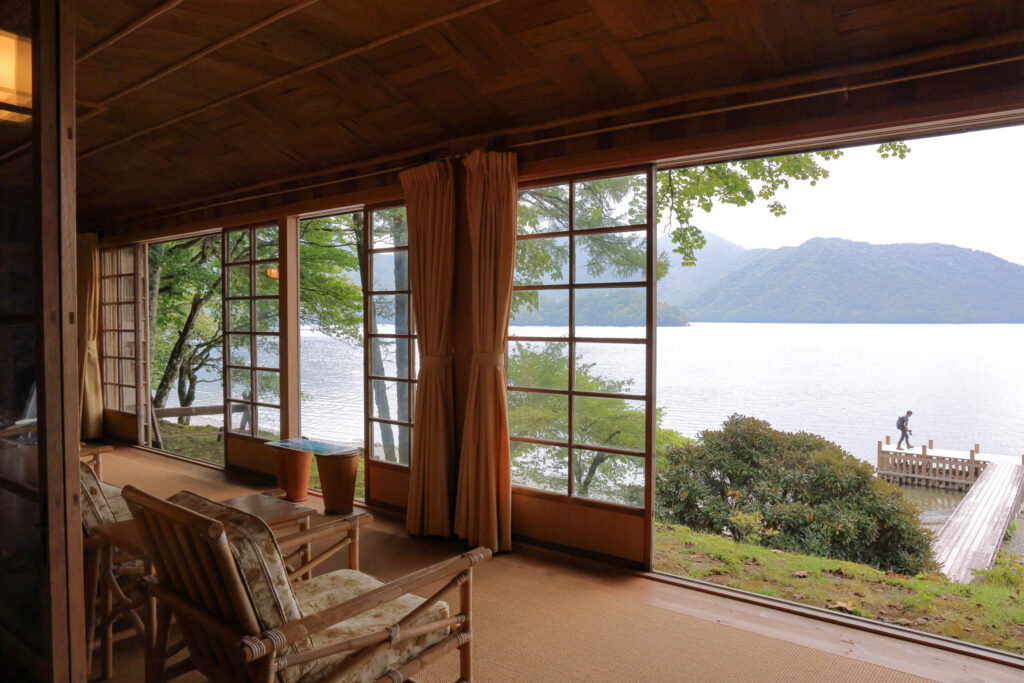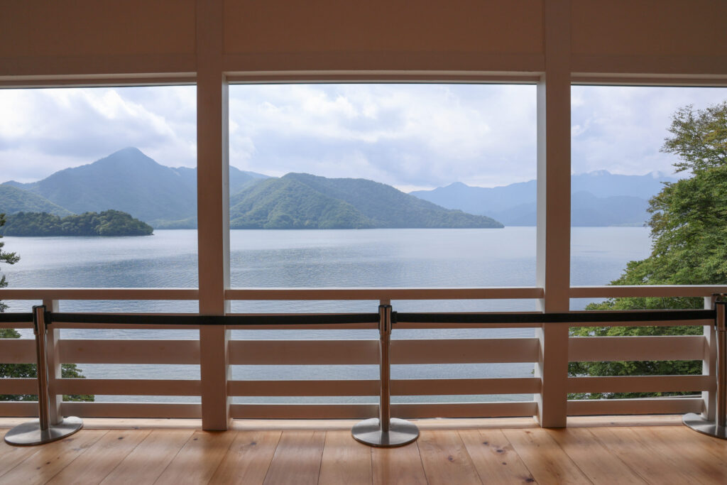 こちらは少し薄暗く落ち着いた館内からみる中禅寺湖の景色がまた素敵です。