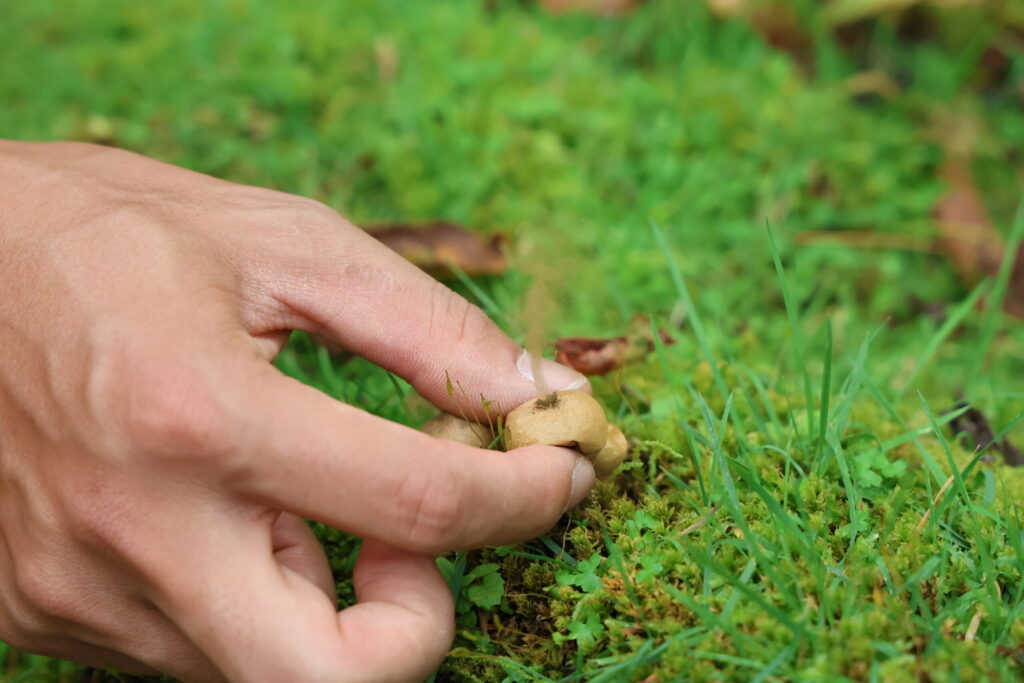 ホコリタケの仲間です。軽くつまんでみると頂点に空いた穴から胞子がたくさん飛び出しました!