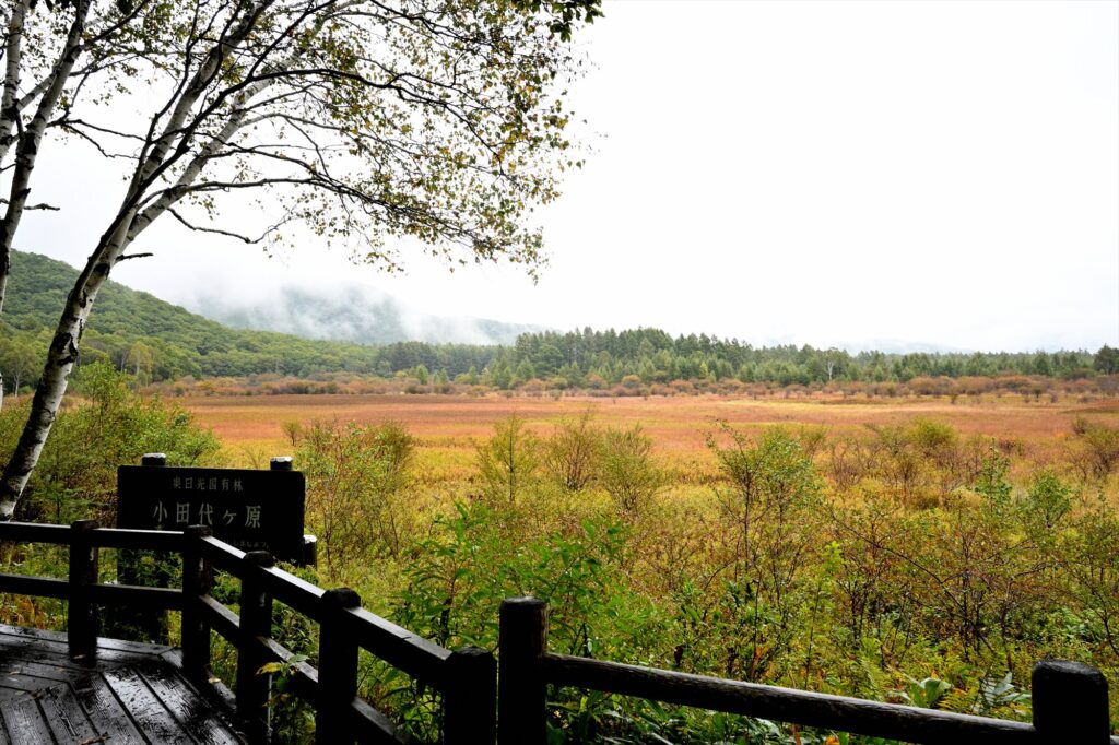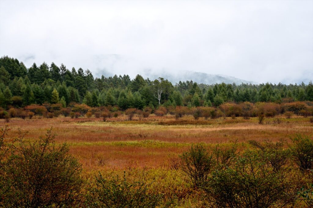 こちらは、草紅葉の色合いがより深まり、湿原が美しい縞模様になっていました。今回は雨が降っていましたが、日差しが無く、しっとり濡れていたことで発色が良く、鮮やかなグラデーションの草紅葉を堪能できました。