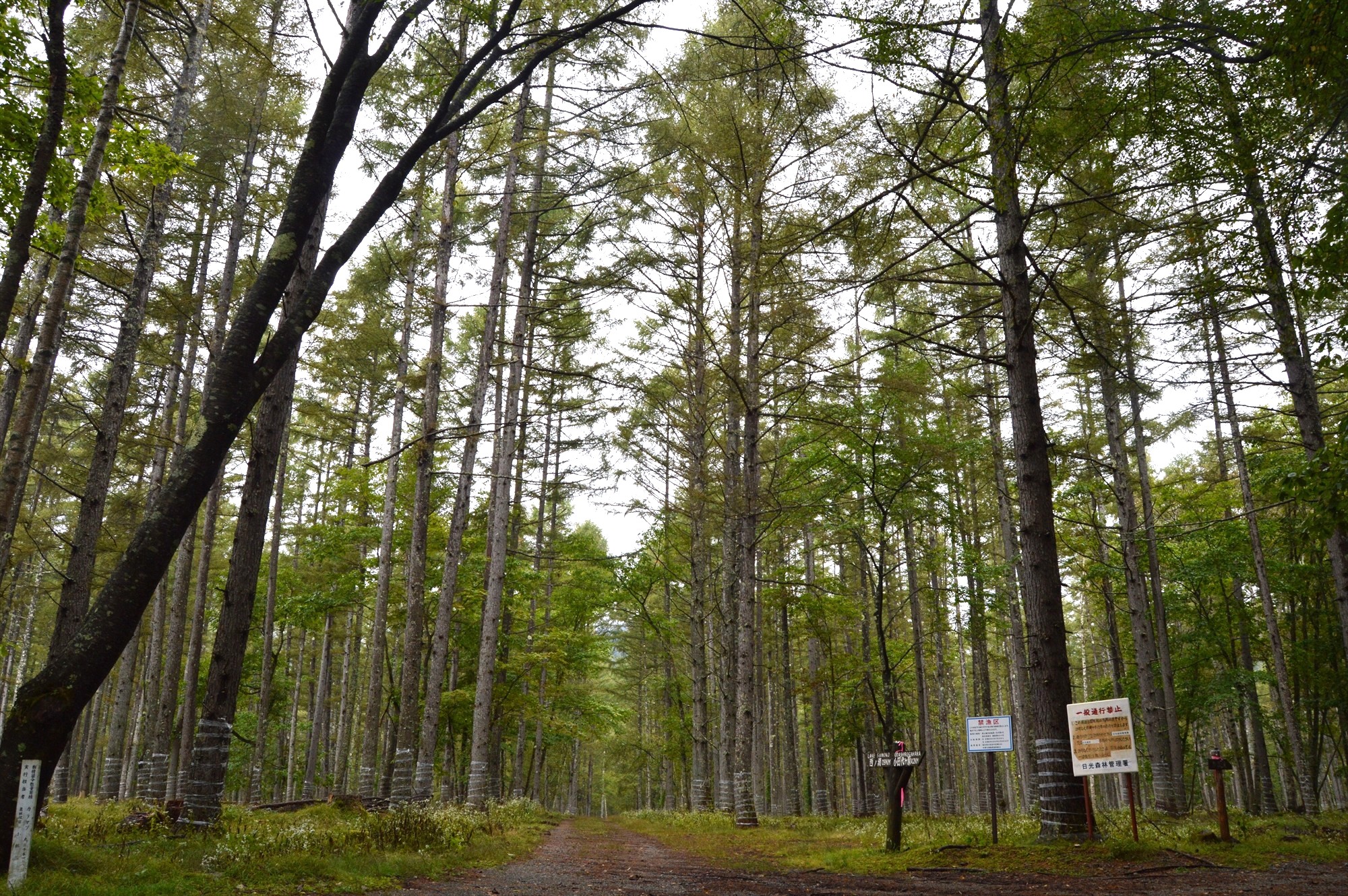 西ノ湖バス停から西ノ湖にかけて広がるカラマツ林は、まだまだ色づきは始まっていませんでした。