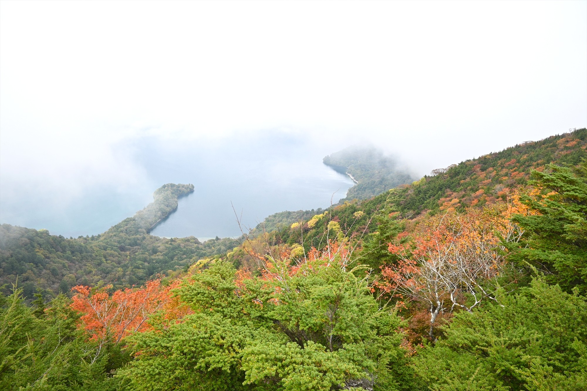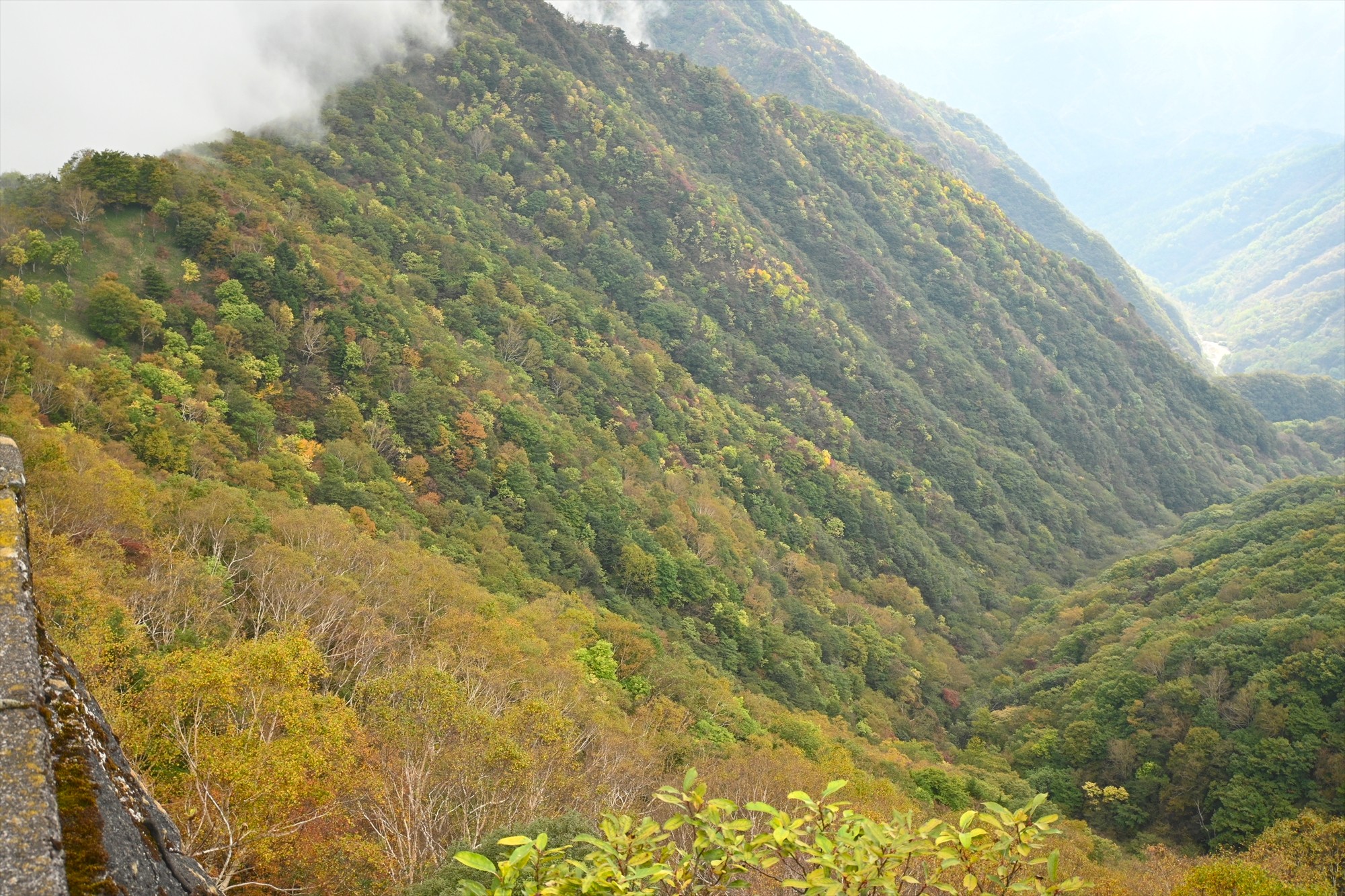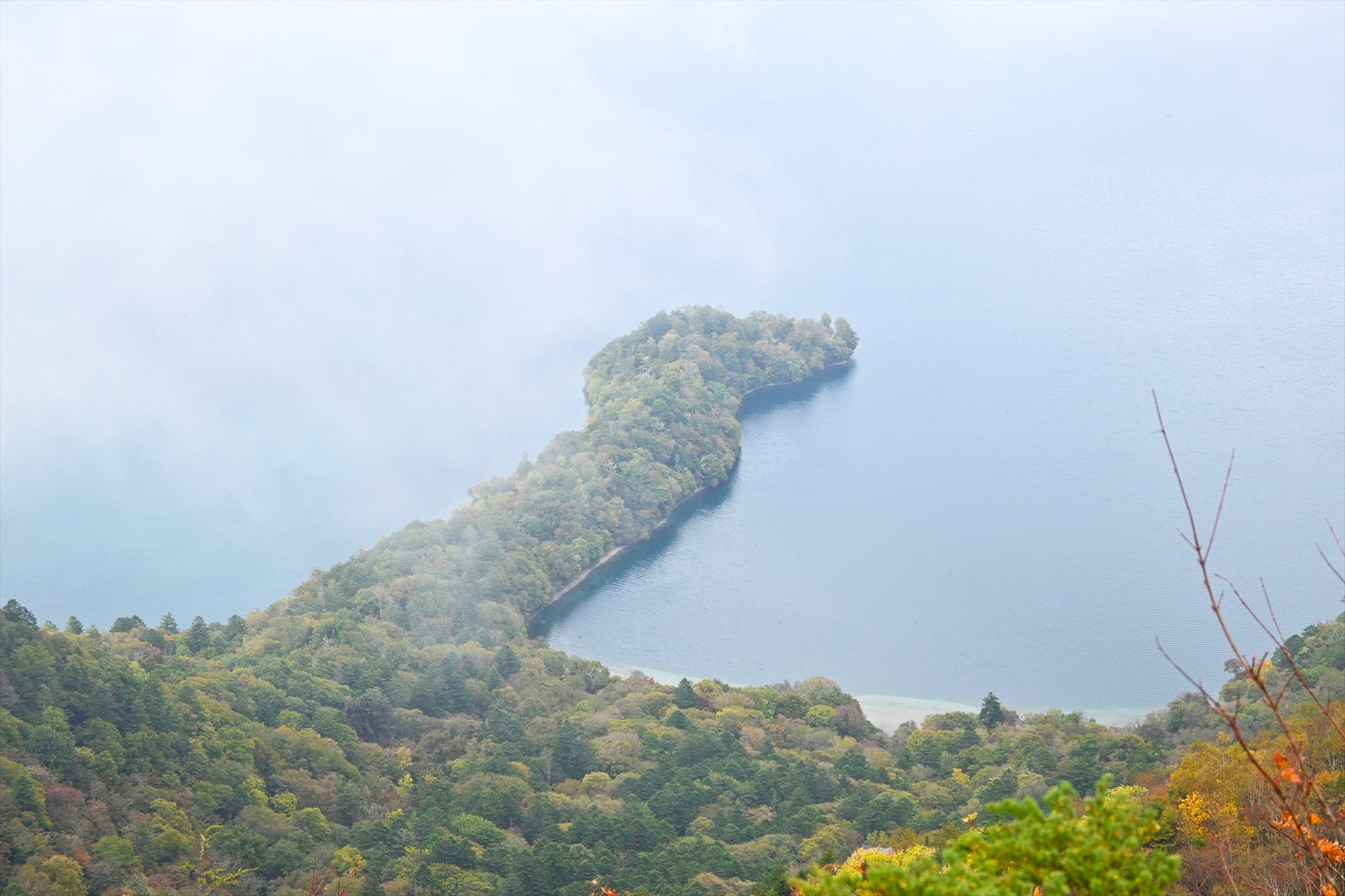 霧の切れ間から見られた八丁出島の方はまだまだ緑が優勢で今後の紅葉に期待が高まります。(しゅんか)