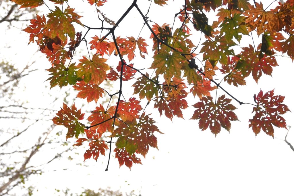 カエデ類は完全に色付いていない状態で緑~黄色~赤とグラデーションになっている枝葉がとても綺麗でした。