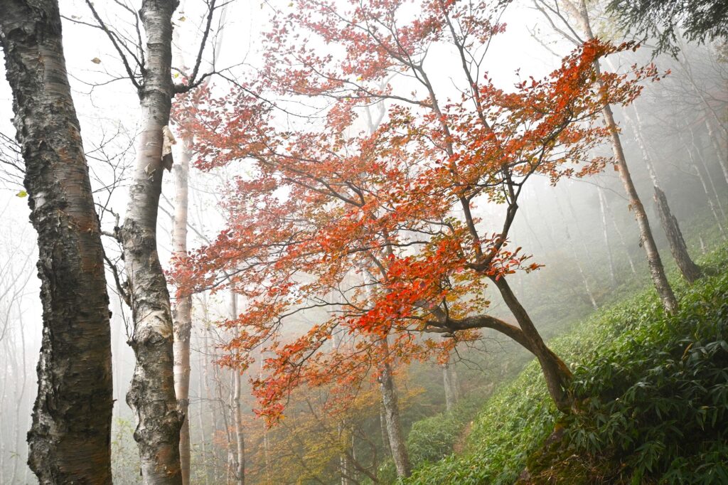 針葉樹の深い緑に燃えるような赤や黄色が入り混じり、秋の深まりを感じます。
