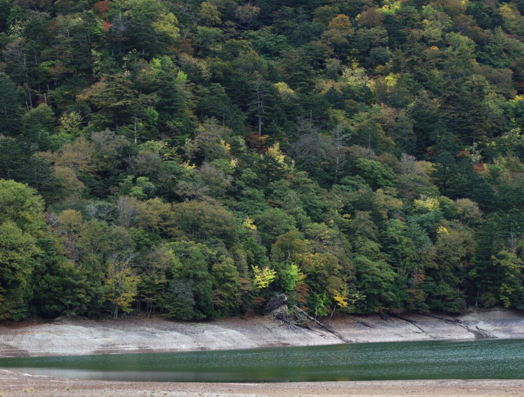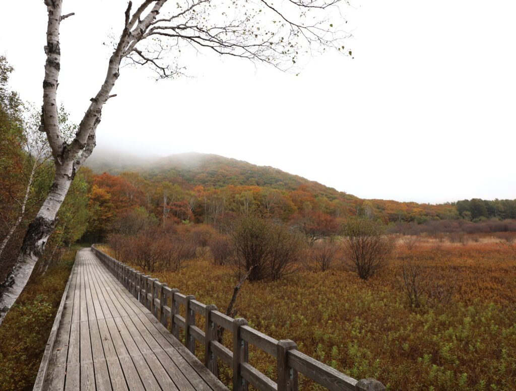 所々に生えているミズナラの黄色と相まってここだけでも趣のある雰囲気を感じられます。