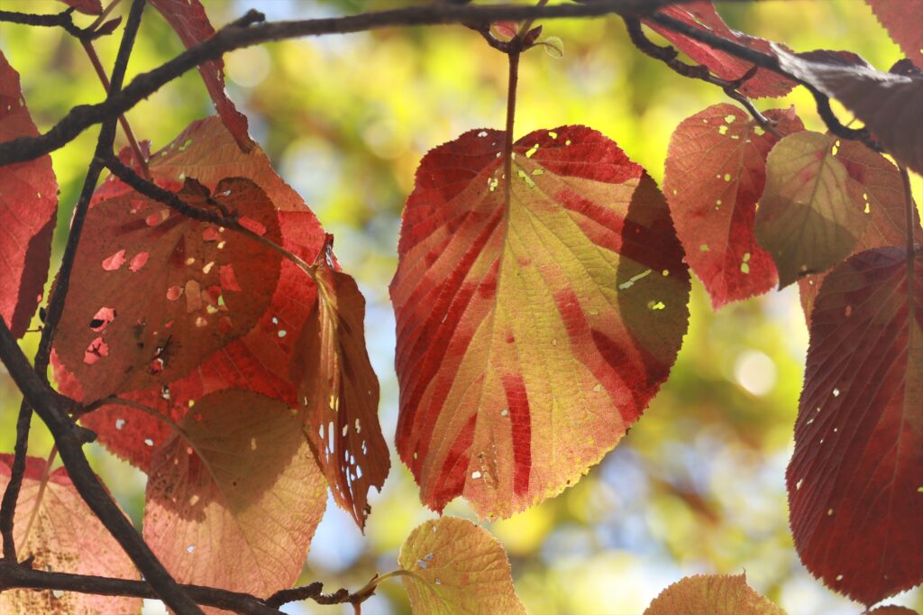 木々に囲まれた遊歩道を歩いていると、まず最初に目を引いたのはツツジの紅葉でした。一枚の葉の中で淡い緑から赤へと変わっていくグラデーションがとても美しかったです!