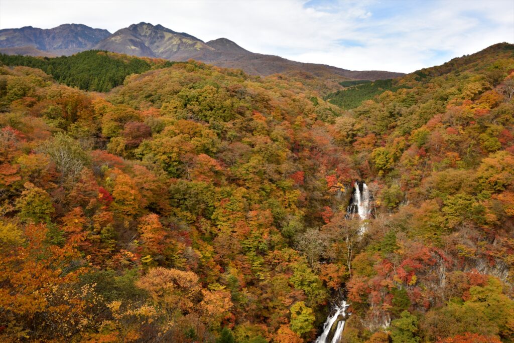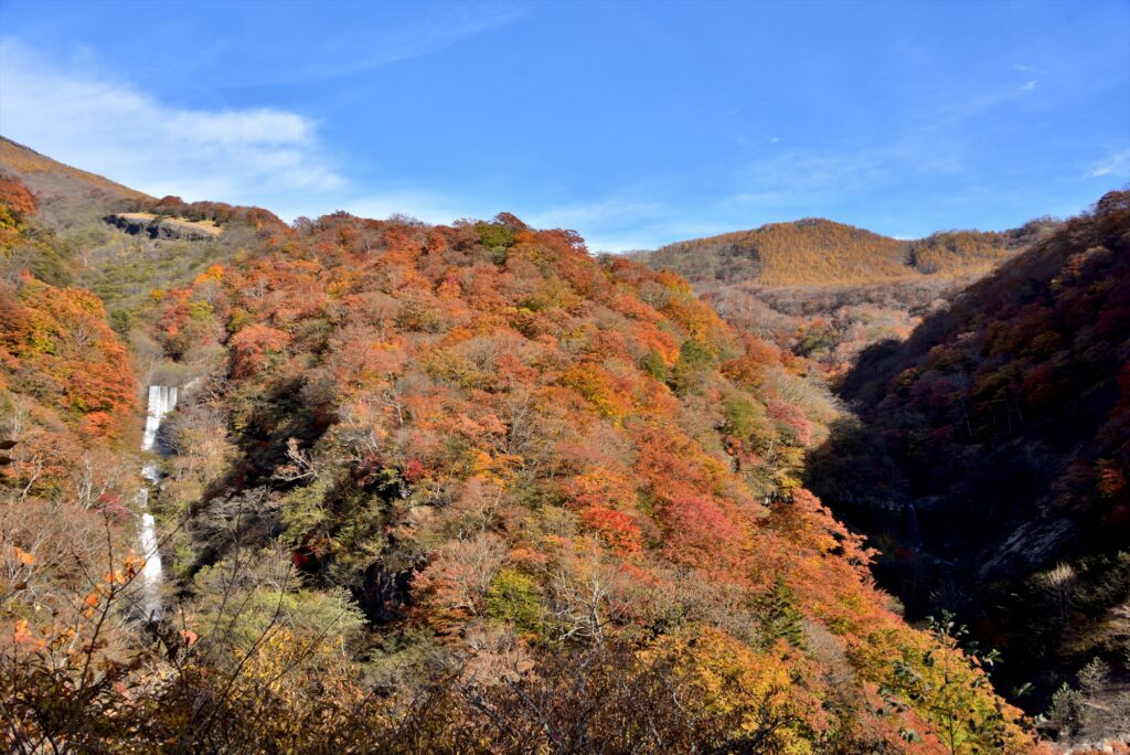 方等滝(写真左)と般若滝(写真右)と併せて紅葉の景色を望むことができます。2つの滝とはっきりとした色合いの紅葉はまさに絶景です!