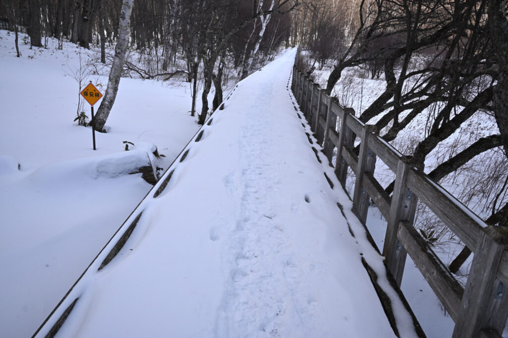 戦場ヶ原よりも木道上の雪が多く、踏まれていない部分では氷と雪の層が計15~20cmほど。中央に踏み跡があるため比較的歩きやすいです。