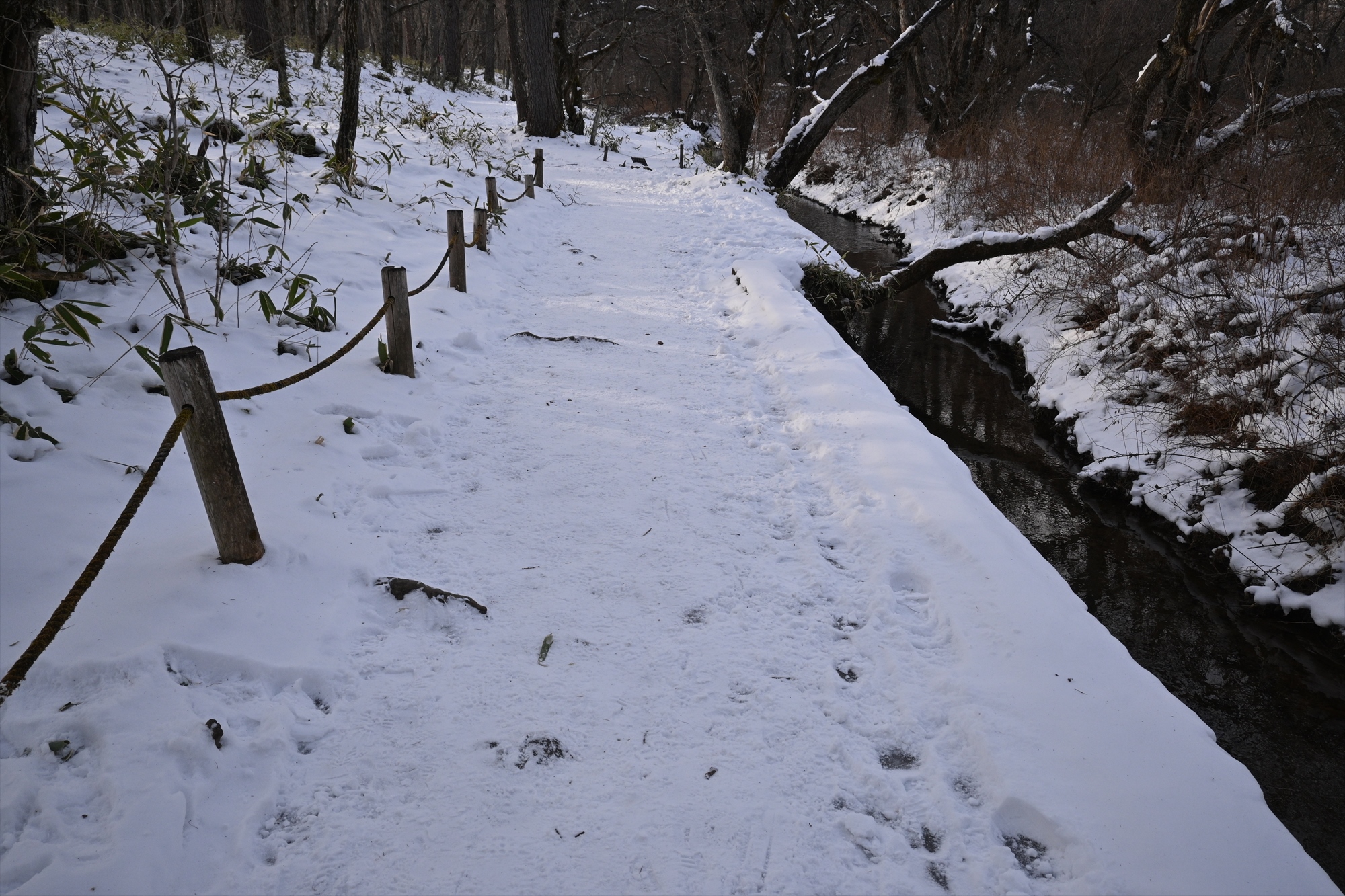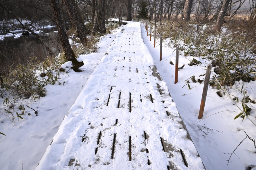 赤沼駐車場~木道までの200mほど、土の道の上に分厚い氷の層があり、その上にパウダースノーが積もっています。