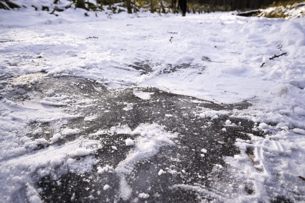 こういった箇所で転ばないために、チェーンスパイクなどの着脱可能な滑り止め器具をご用意いただくと良さそうです。