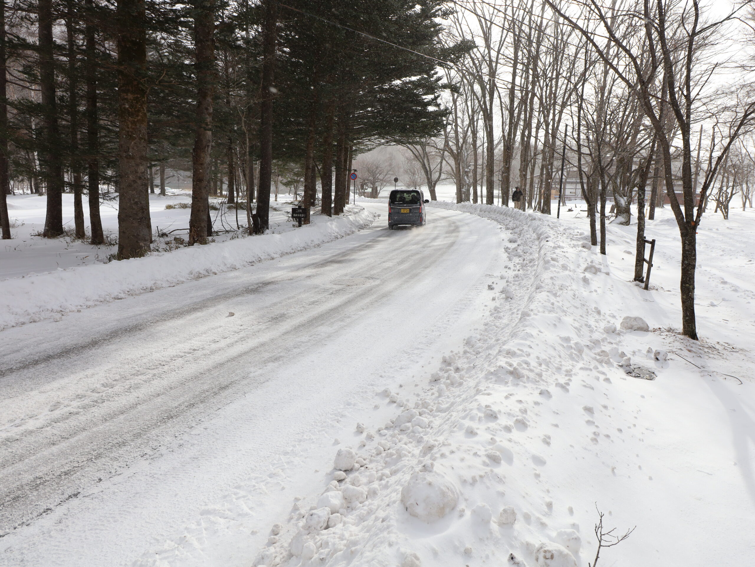 お越しの際はスタッドレスタイヤは必須、散策する場合にはスノーブーツなどの丈が高く滑りにくい靴がオススメです。
