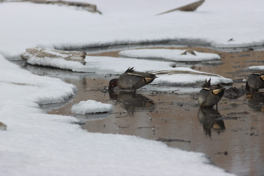 コガモは浅瀬で餌を食べることが多いですが、彼らが好むヨシの茂る浅い水場が温泉のおかげで冬でも雪に埋もれないためか毎冬この湿原に姿を現します。