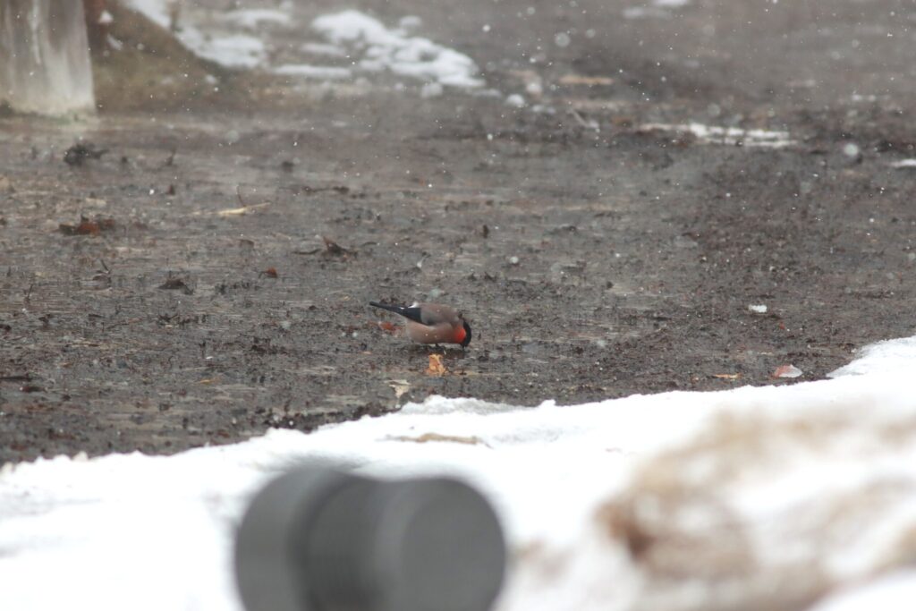 これは珍しいの…?と思ってしまう方も多いと思いますが、奥日光では地面に落ちた植物の実や種は雪に埋もれてしまいます。そのため本来ウソはこれを掘り起こすことができず餌にありつけません。しかし、温泉によって雪が積もらず地面が露出しているこの場所は数少ない餌場になっているようです。