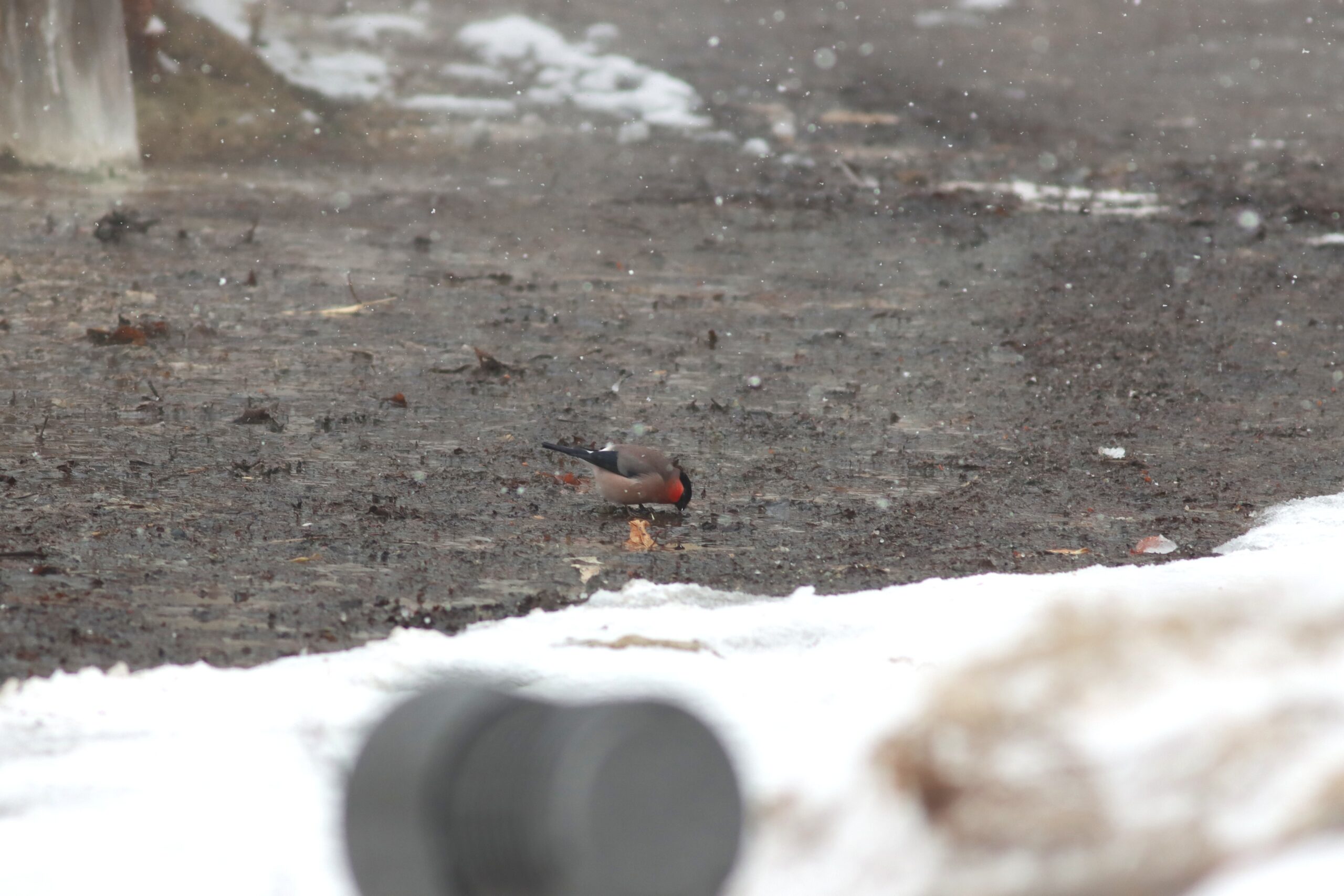 なんと今回は雪が溶けた地面から何かをついばんでいるというあまり見られないシチュエーションを観察することができました。