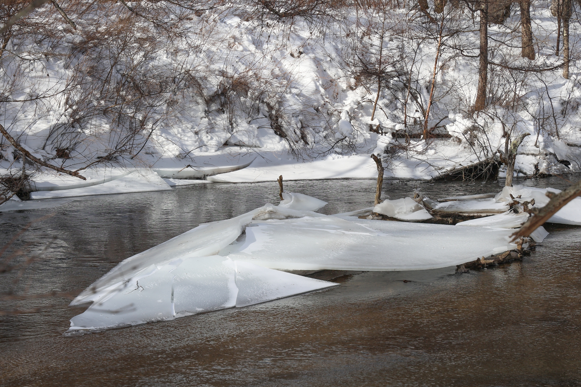 木道入口までの水路や湯川沿いでは川岸や中州、流木などに氷ができていました。寒波の際には-10℃以下の厳しい冷え込みになっていたはずなので、もしかすると、数日前までは川を覆うように氷が張っていたのかもしれませんね。