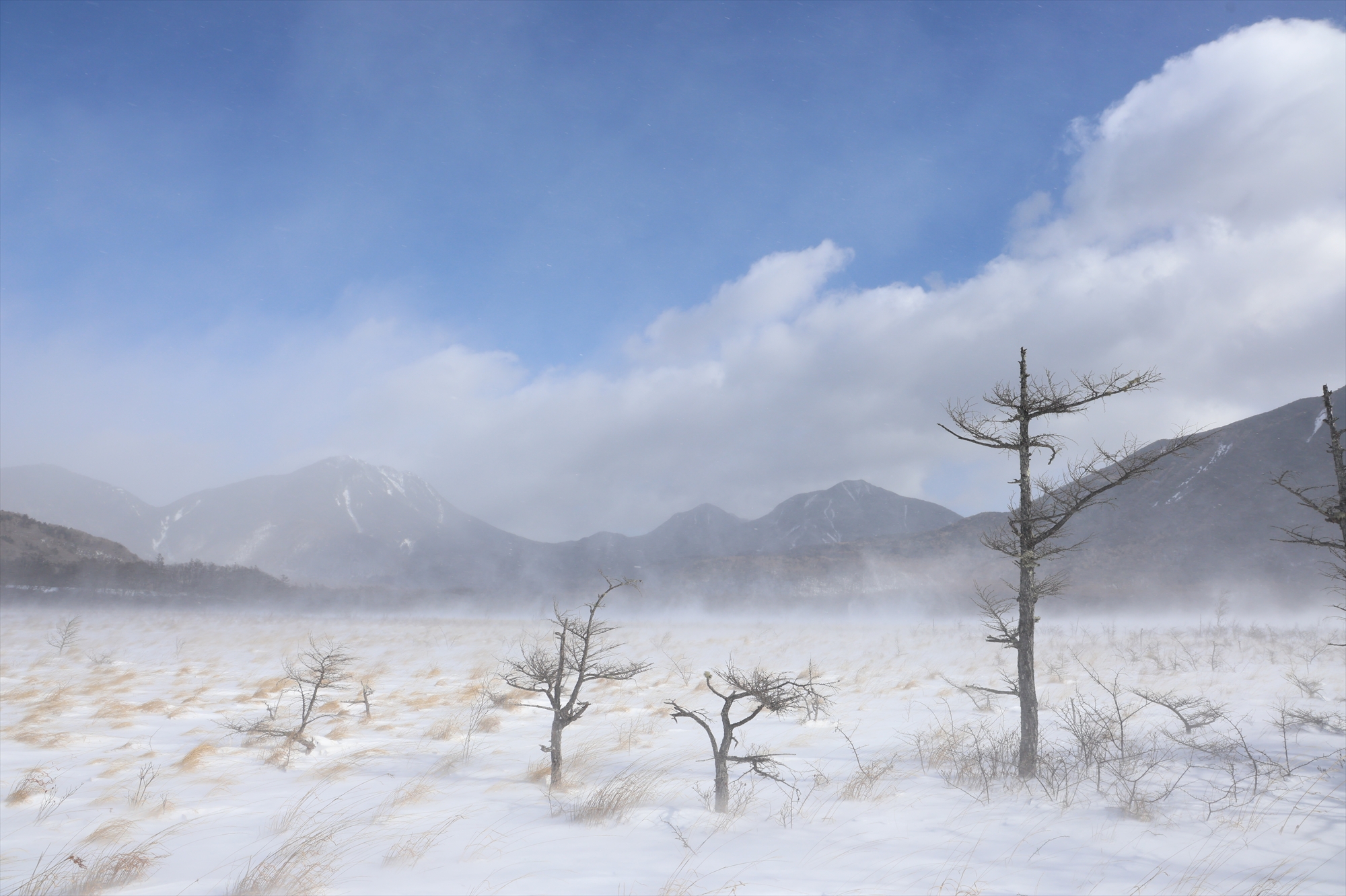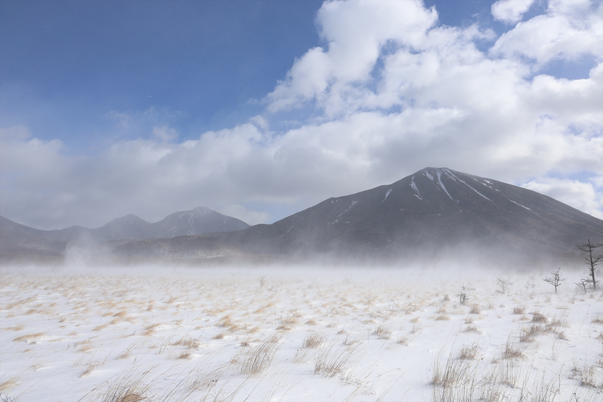 時折10m近い風が吹き、雪の多い日本海側気候の影響を受ける湯元方面からは雪が飛ばされてきて、湿原内の雪が巻き上げられ地吹雪が起こるなど、厳冬期らしい荒れ模様でした。