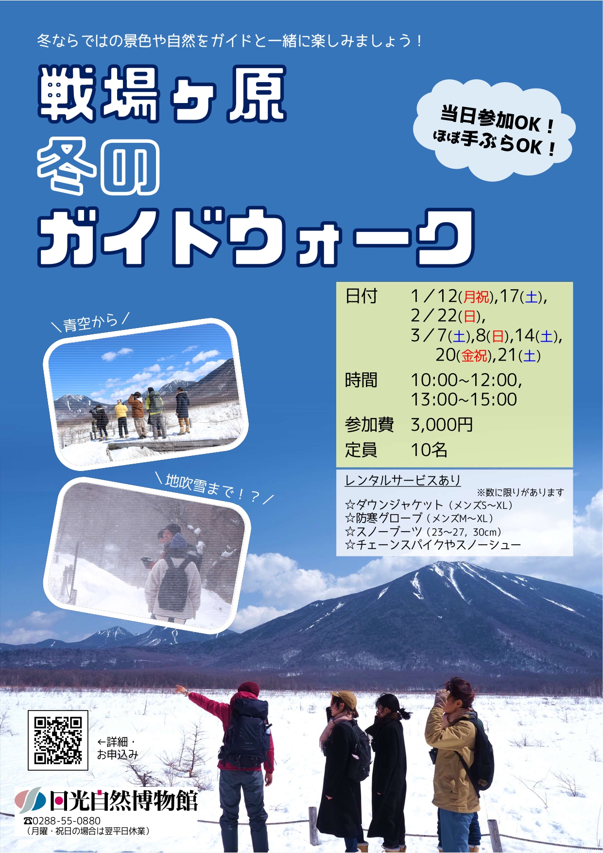 戦場ヶ原ガイドウォークでは、今回紹介したその日・その時の景色について解説したり、野鳥、動物の痕跡など様々な自然物との出会いも期待できます。上着やスノーブーツを始めとした装備品のレンタルサービスも充実していますので、初めてという方もぜひご参加ください!