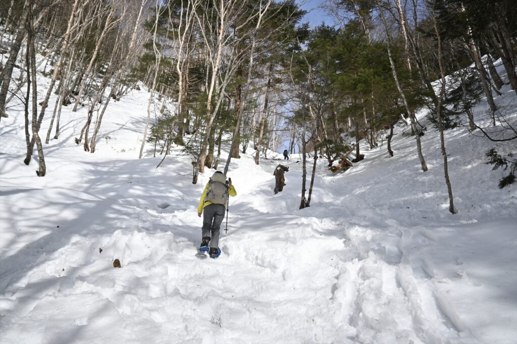 また、雪は踏み固められていて、急登や滑りやすい場所もあるため、スノーシューの刃を上手く使って登る必要があります。