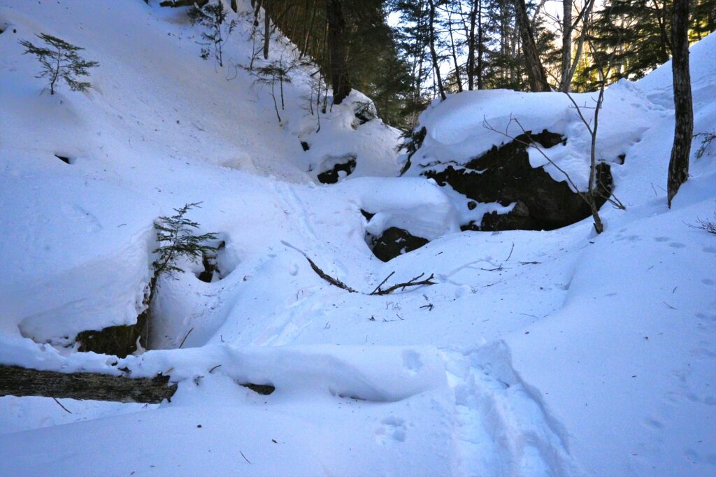 地形から毎年小規模な雪崩が起こる場所が見られたり、谷地形の中には巨大や岩や倒木が多くあり、その上に雪が積もるので踏み抜き等の危険があります。