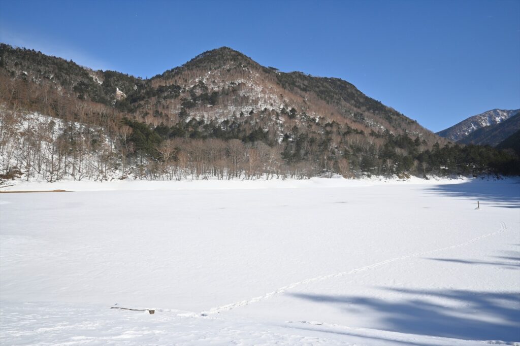 湖は全面的に凍っていて、周囲の山々も雪で覆われていました。針葉樹の黒味の強い葉に白い雪が合わさって水墨画のようで、とても綺麗な景色が広がっていました。