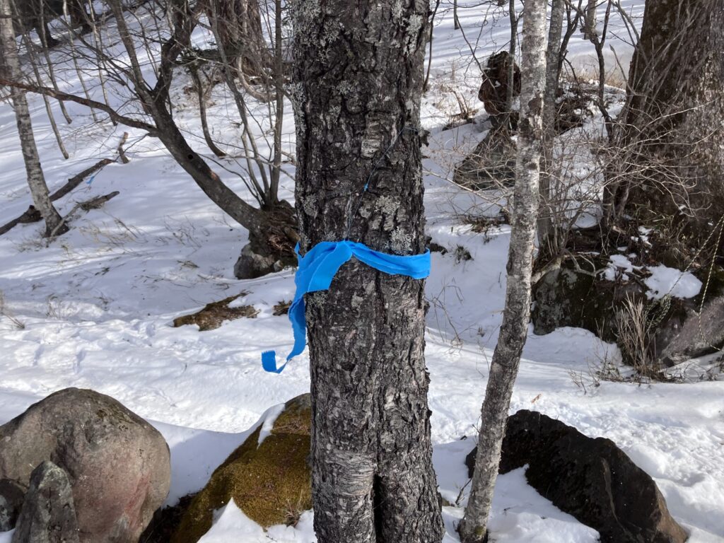 このコースは途中の小峠まではスノーシューコースとして整備されていて、水色のリボンが幹や枝先にかけられていますが、小峠から刈込湖にかけては夏の遊歩道に雪が積もり歩けなくなるため、急登や谷地形のような管理されていない場所を歩いていきます。