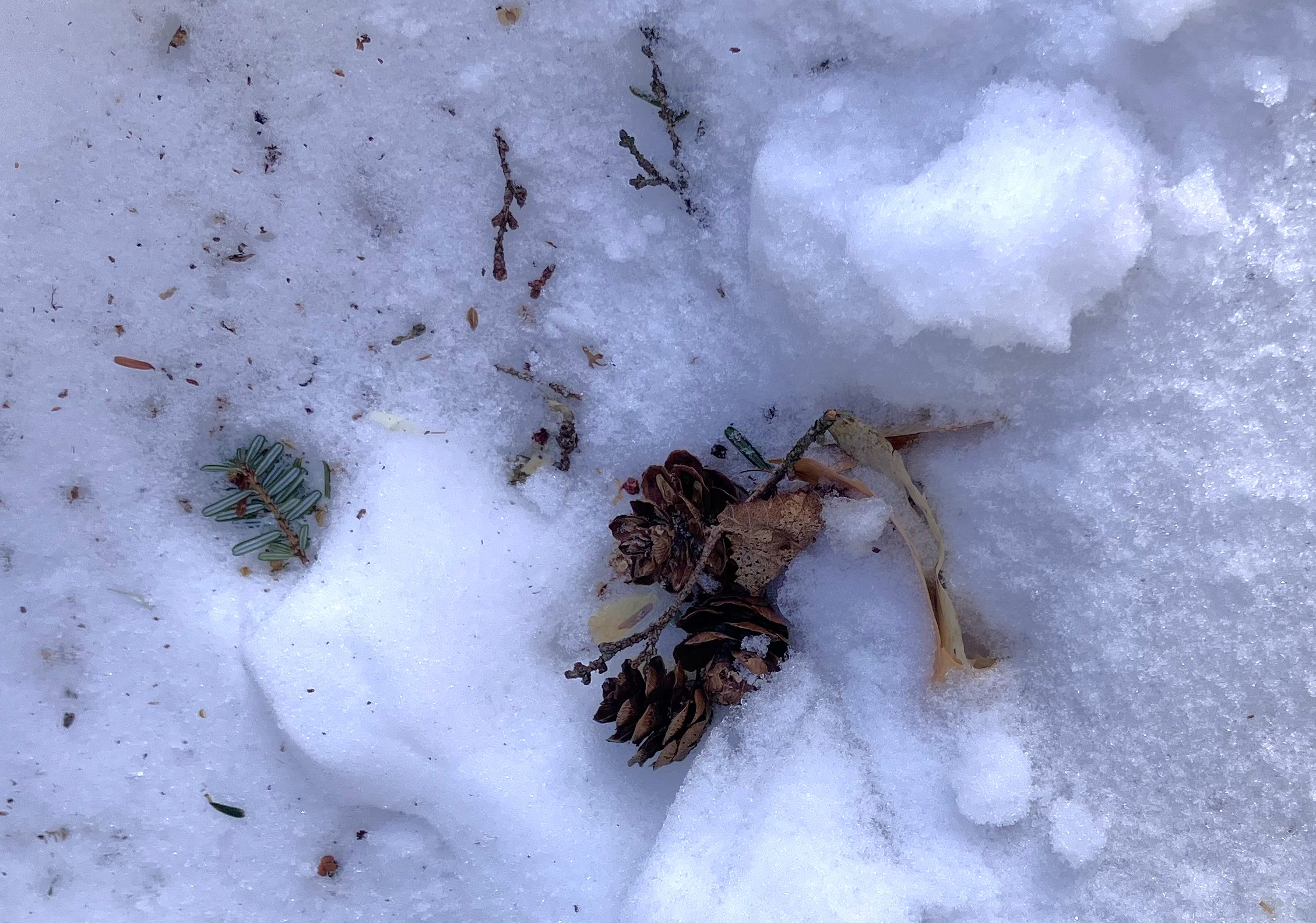 大きさも形も様々な物が白い雪の上に沢山落ちていたのでご飯に振りかけられたふりかけのように見えたみたいです。