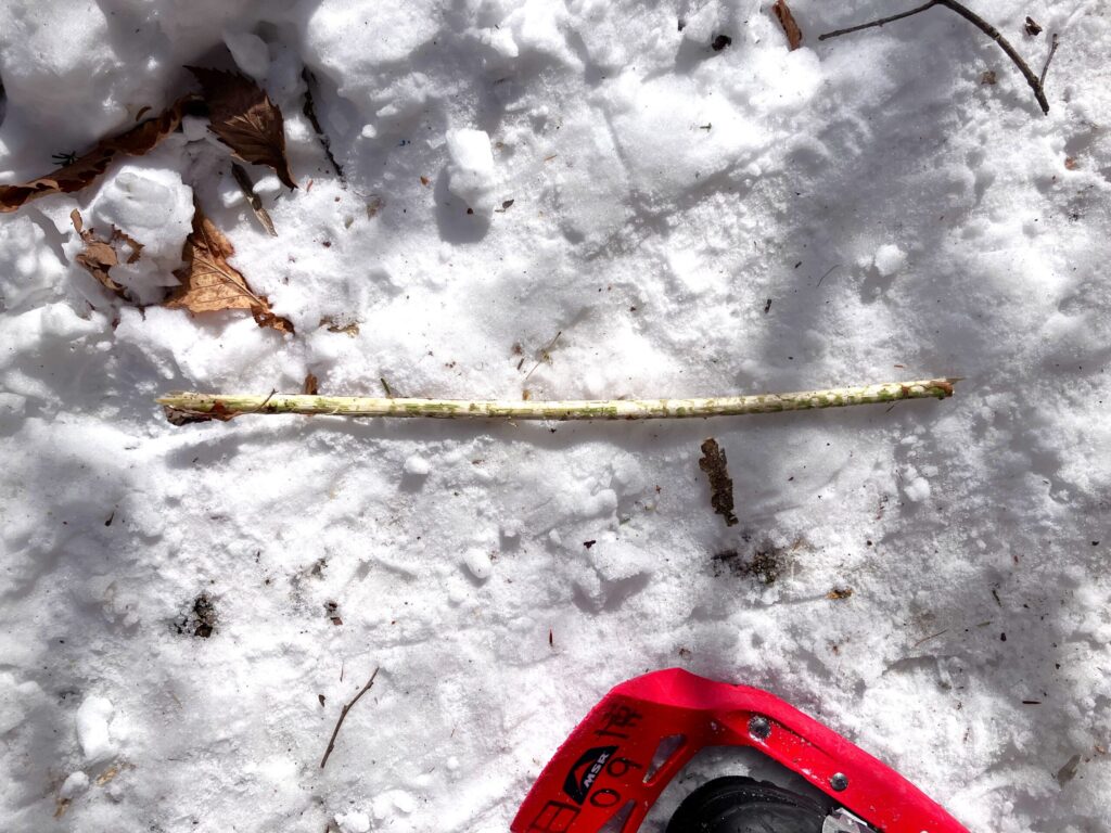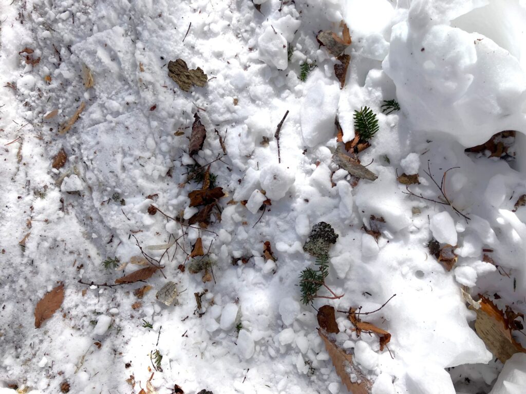 理由と言うのは、このコースは地形のバリエーションがあるために様々な樹木が生えていること、冬場特有の強い風が吹くことで、雪上に大小様々色々な物が落ちているんです。