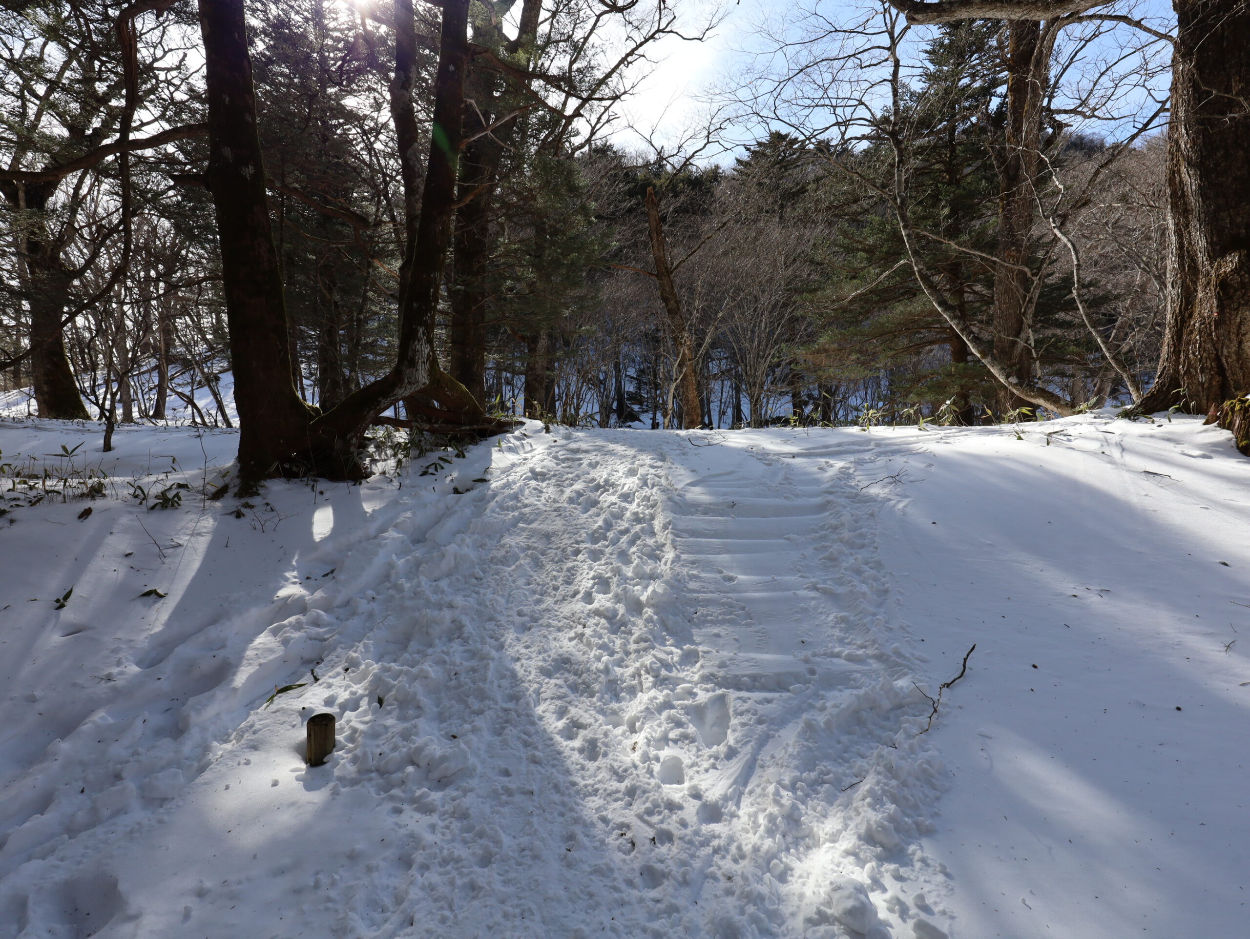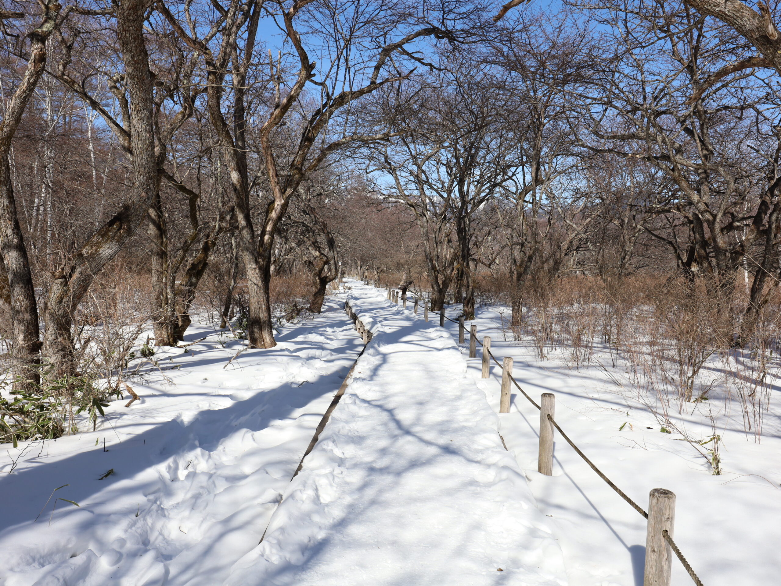 ここ一週間以上まとまった降雪はありませんでしたが、戦場ヶ原の木道上は基本的に厚さ5~10センチほどの圧雪になっていました。