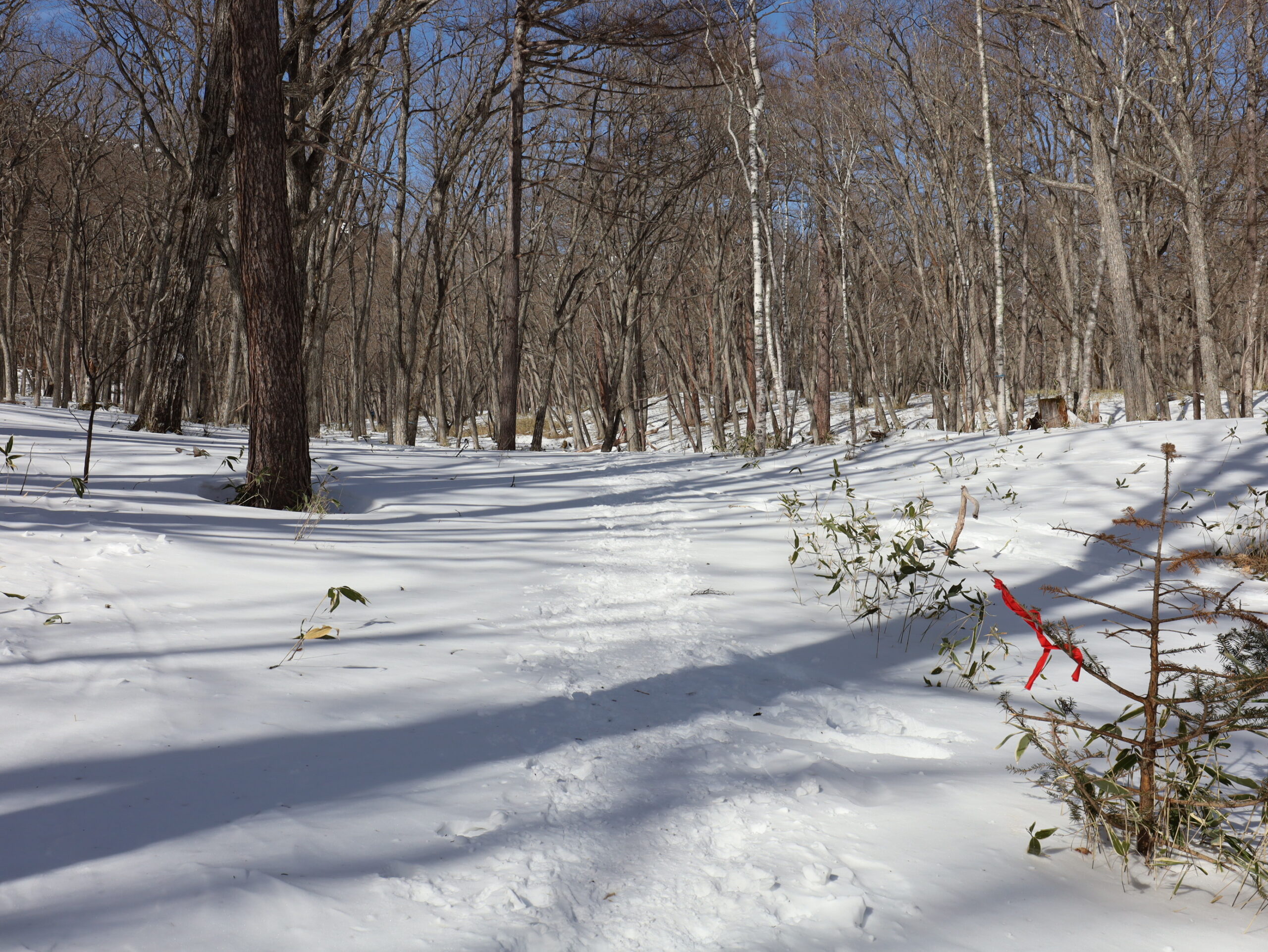 現時点ではトレースが踏み固められており、ツボ足でも歩けますがこのあと降雪状況によってはスノーシューが必要になる可能性がありそうです。