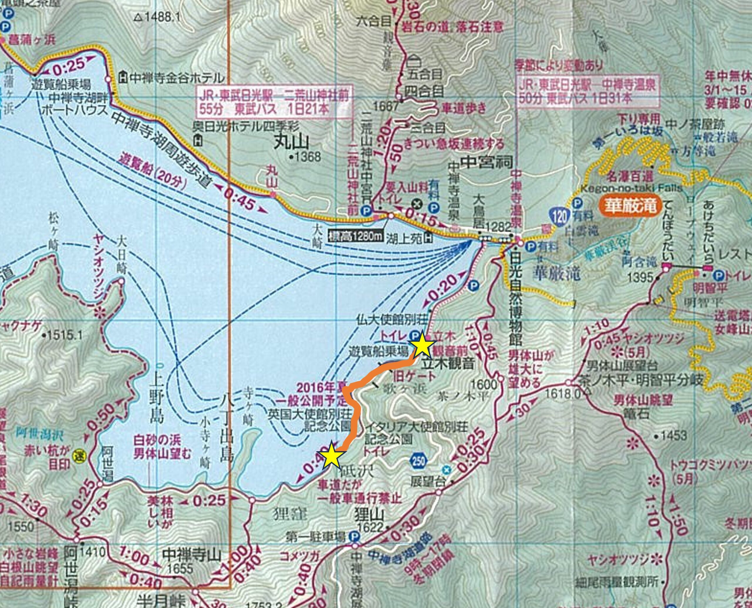 今回は中禅寺湖南岸の歌ヶ浜駐車場からイタリア大使館別荘記念公園付近までを歩いてきました。片道20分ほどのコースになります。
