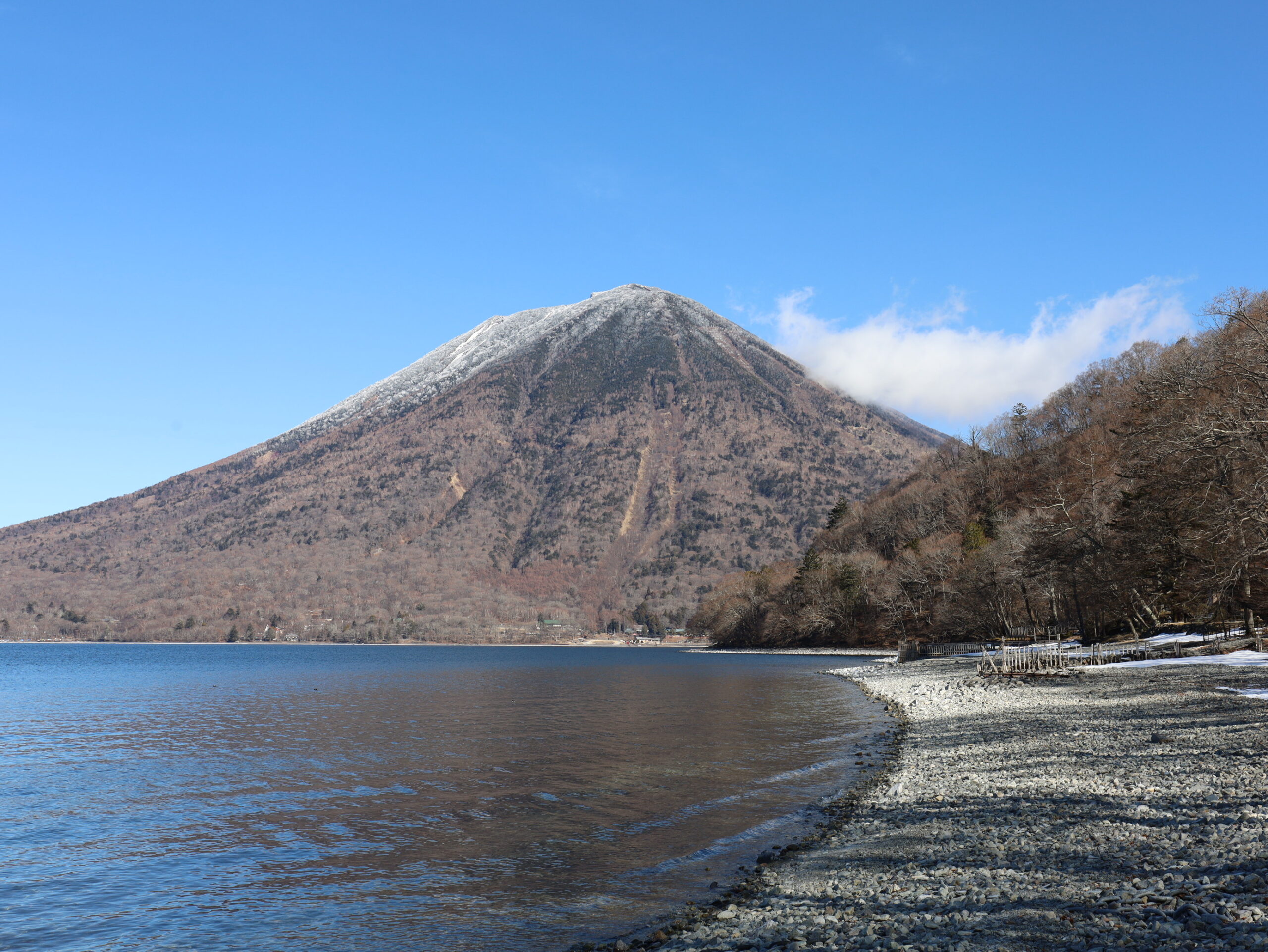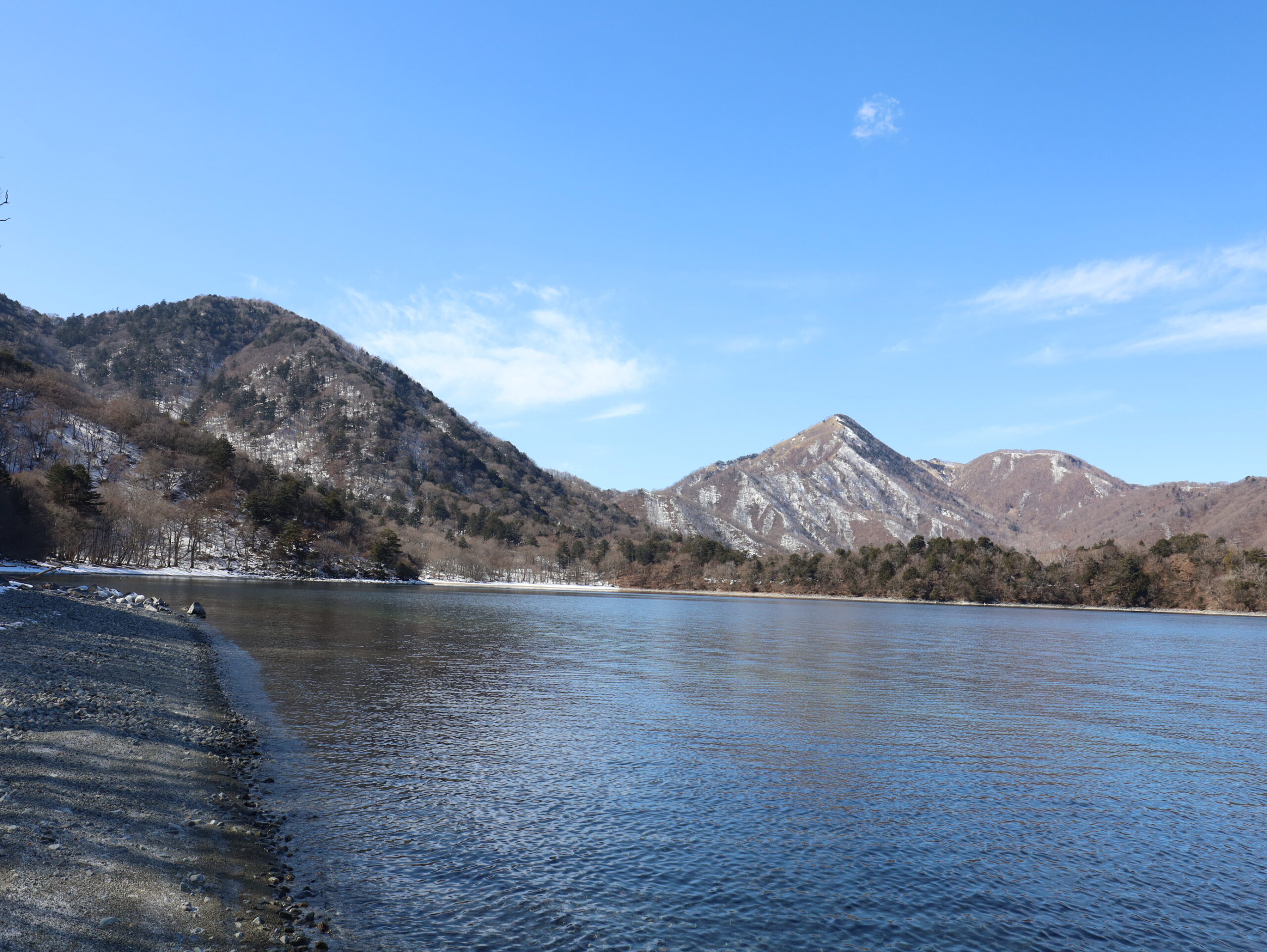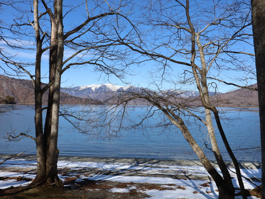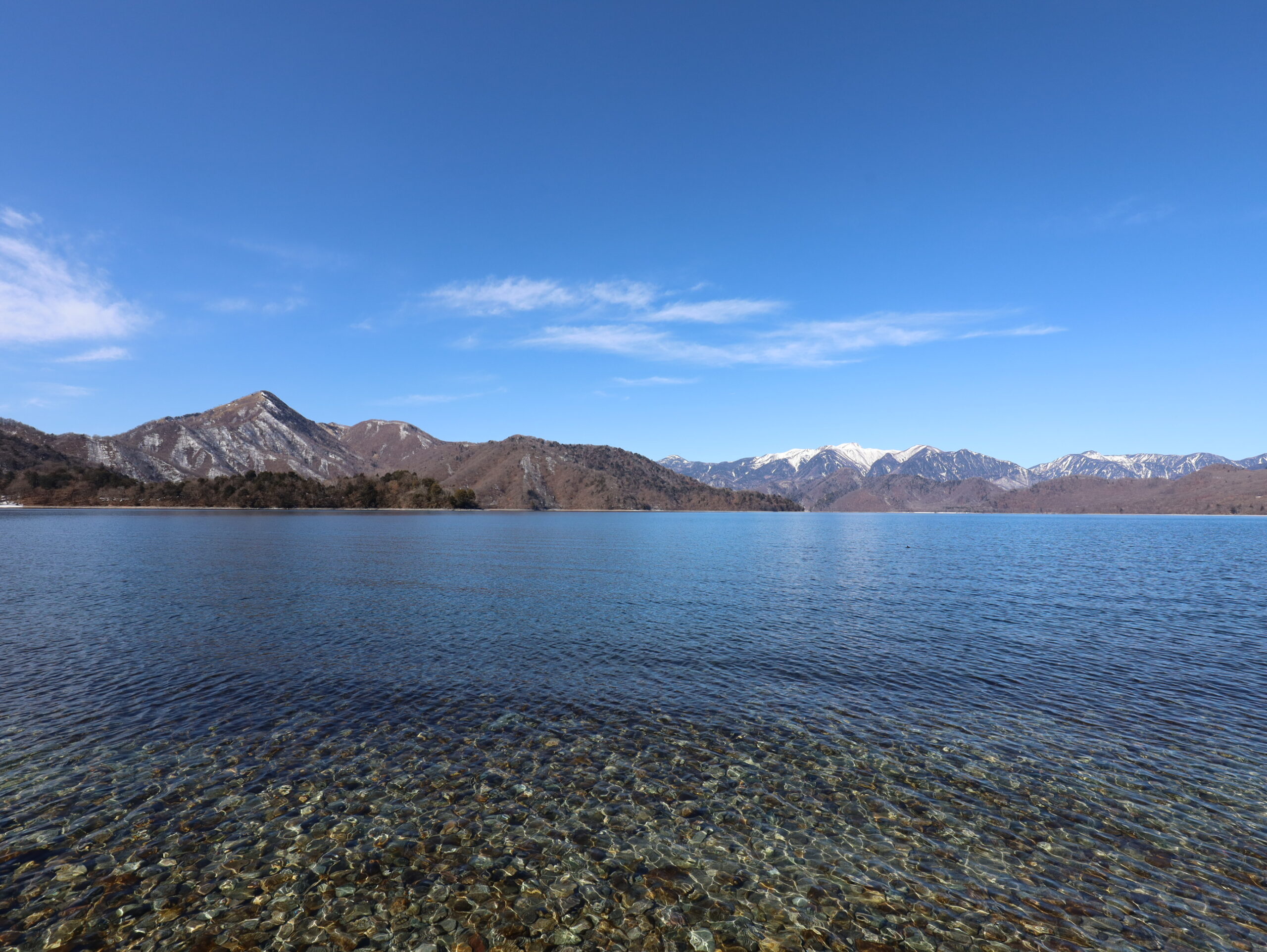 深い青の中禅寺湖と春を彷彿とさせる淡い青色の空が生み出すグラデーションの中に雪化粧を纏った山々が立ち並ぶ雄大な光景です。