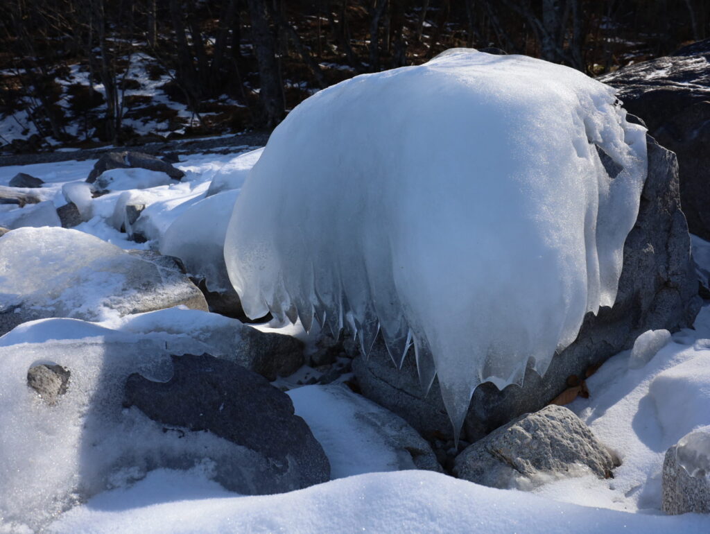 そんな季節が進みつつある景色の中に冬の名残も残っていました。風によって岸に打ち付けられた湖水の飛沫が岩や木に付着して凍るしぶき氷です。