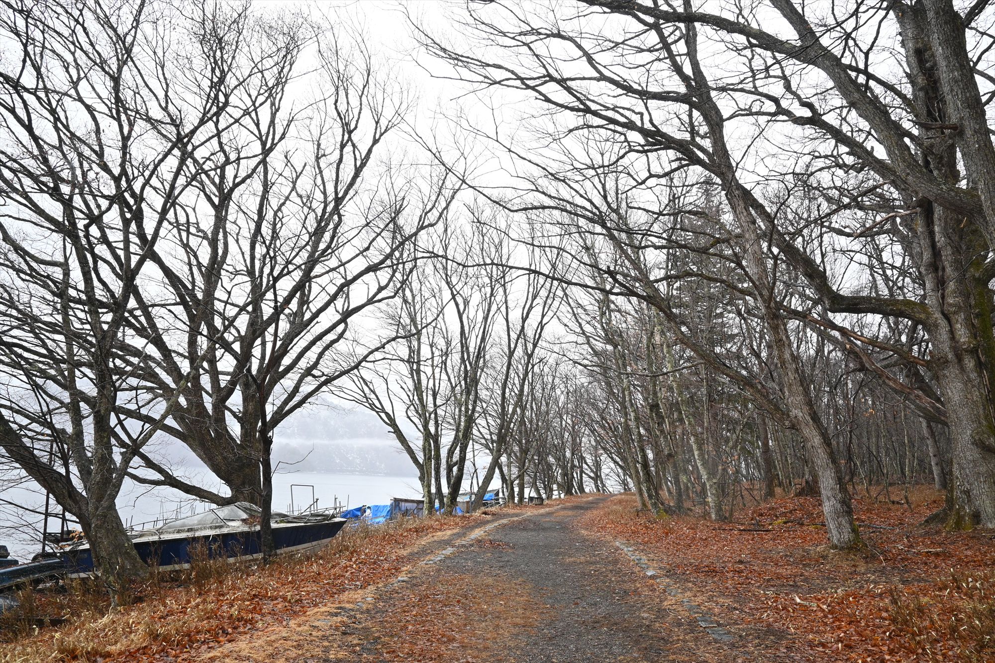 葉が落ちた、枝の隙間からは常に中禅寺湖が見えていて、今回は冬らしからぬ雨によって作り出されたこの景色に、とても心を動かされました!