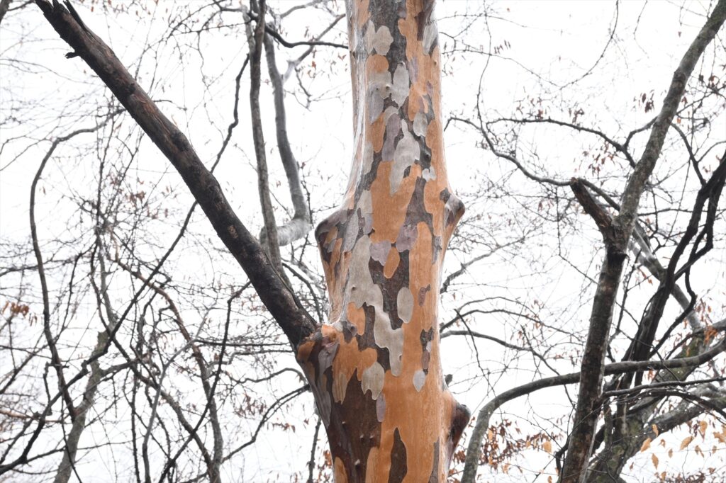 ナツツバキです。なんといってもその色や模様が特徴的で、飴色、薄いあずき色、灰色、こげ茶色と、様々な色の樹皮が迷彩模様を作り上げていました。