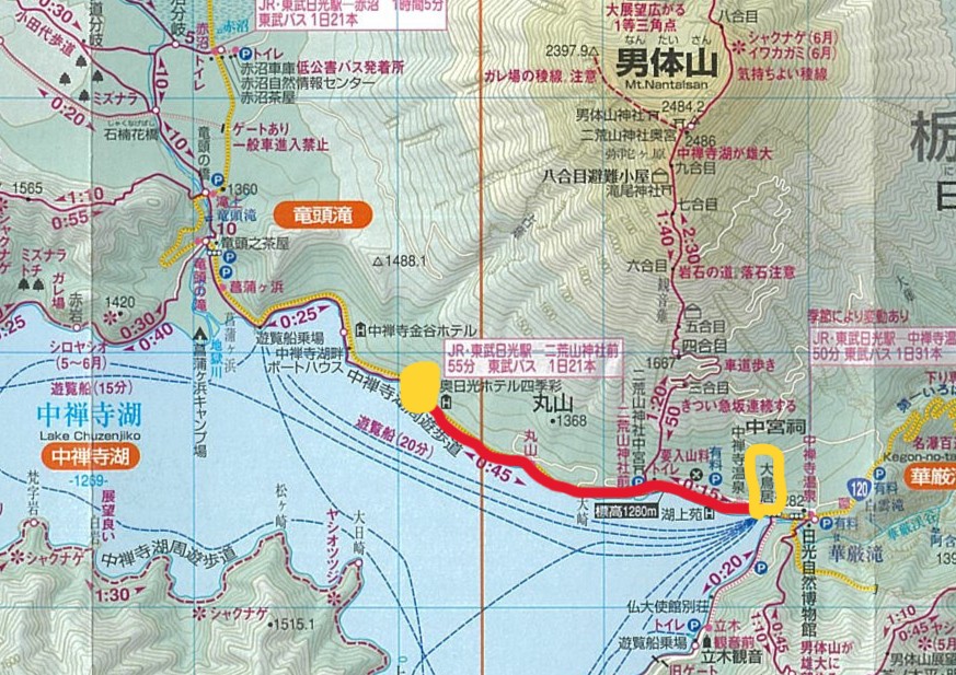 今回は、中禅寺湖の湖尻の大きな鳥居がある辺りから、丸山駐車場付近までの片道約2.5kmの区間を歩いてきました。普段あまり紹介していない道ですが、中禅寺の町中からバス路線に沿った平坦な道なので、はじめての方でも安心して歩く事が出来ます。