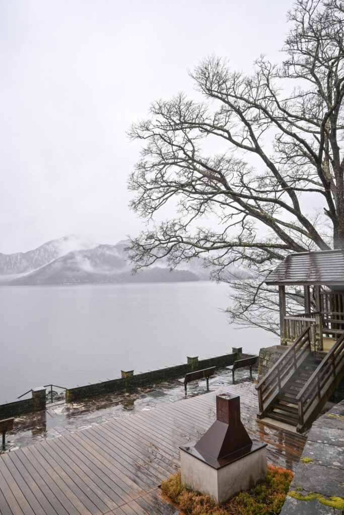 冬の中禅寺湖は、対岸の雪山とスッキリと晴れた青空が印象的です。しかし、雨降りの今回は、綺麗な雪山はそのままに、山の低い位置でたなびく雲、全体的にしっとりとかすんだ様子で、一言に『冬景色』だけでは語れない美しさがありました。