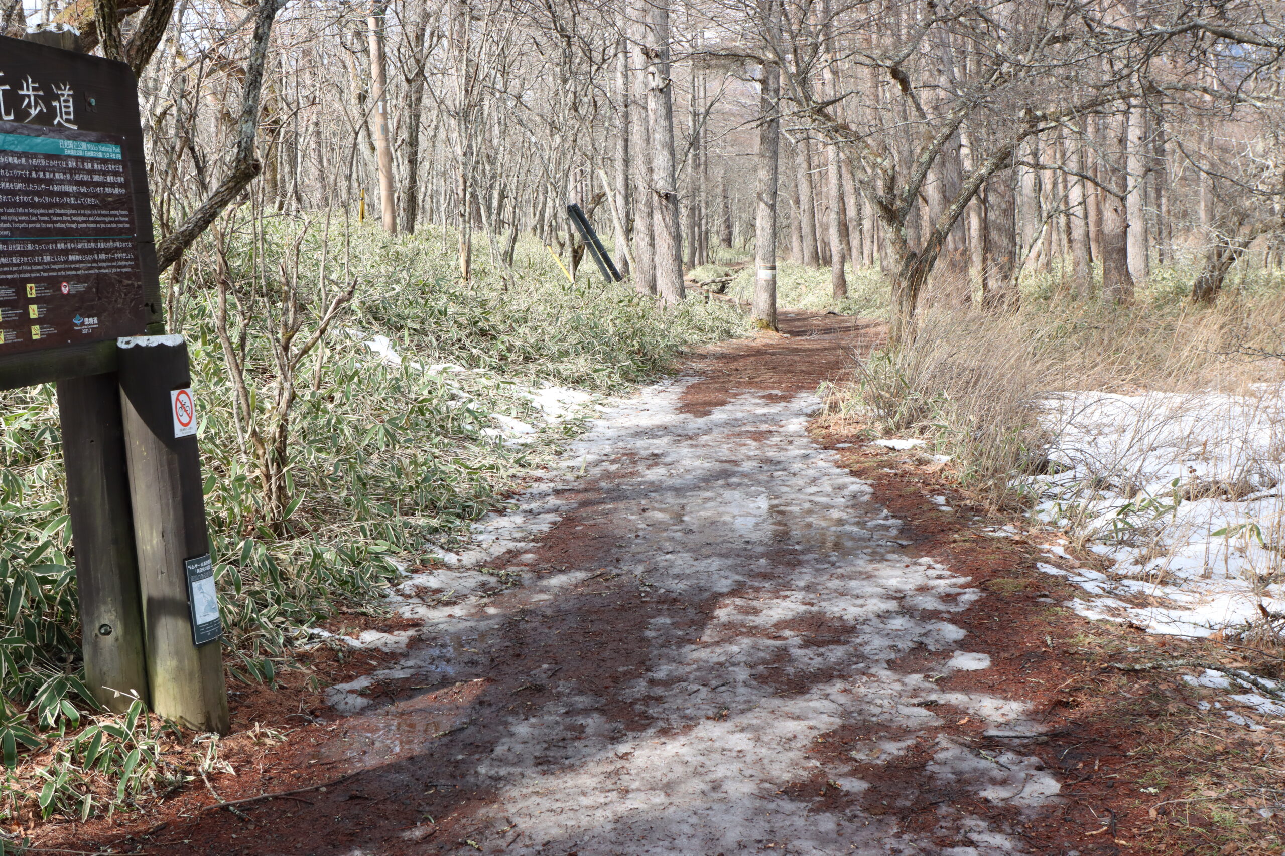 赤沼から戦場ヶ原木道入り口までに行く土の道は雪解け水によってかなりぬかるんでいます。