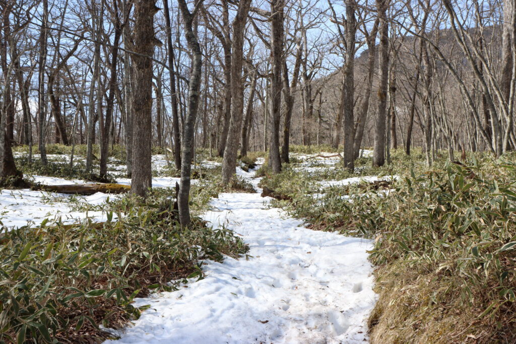 泉門池から折り返し、小田代原に向かう道中もまだしっかり雪があります。