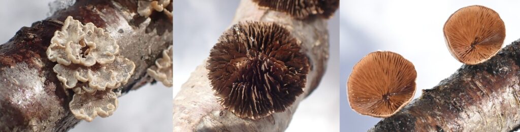 ある物とはキノコです。1つの枝にウニのような見た目の物や白いレース状の物、小さな茶色の茶碗のような物と異なる形状のキノコが3種類もついていました。見た目が異なるキノコが1つの細い枝に沢山生えている状態を初めて目にしたので、思わずまじまじと観察してしまいました。