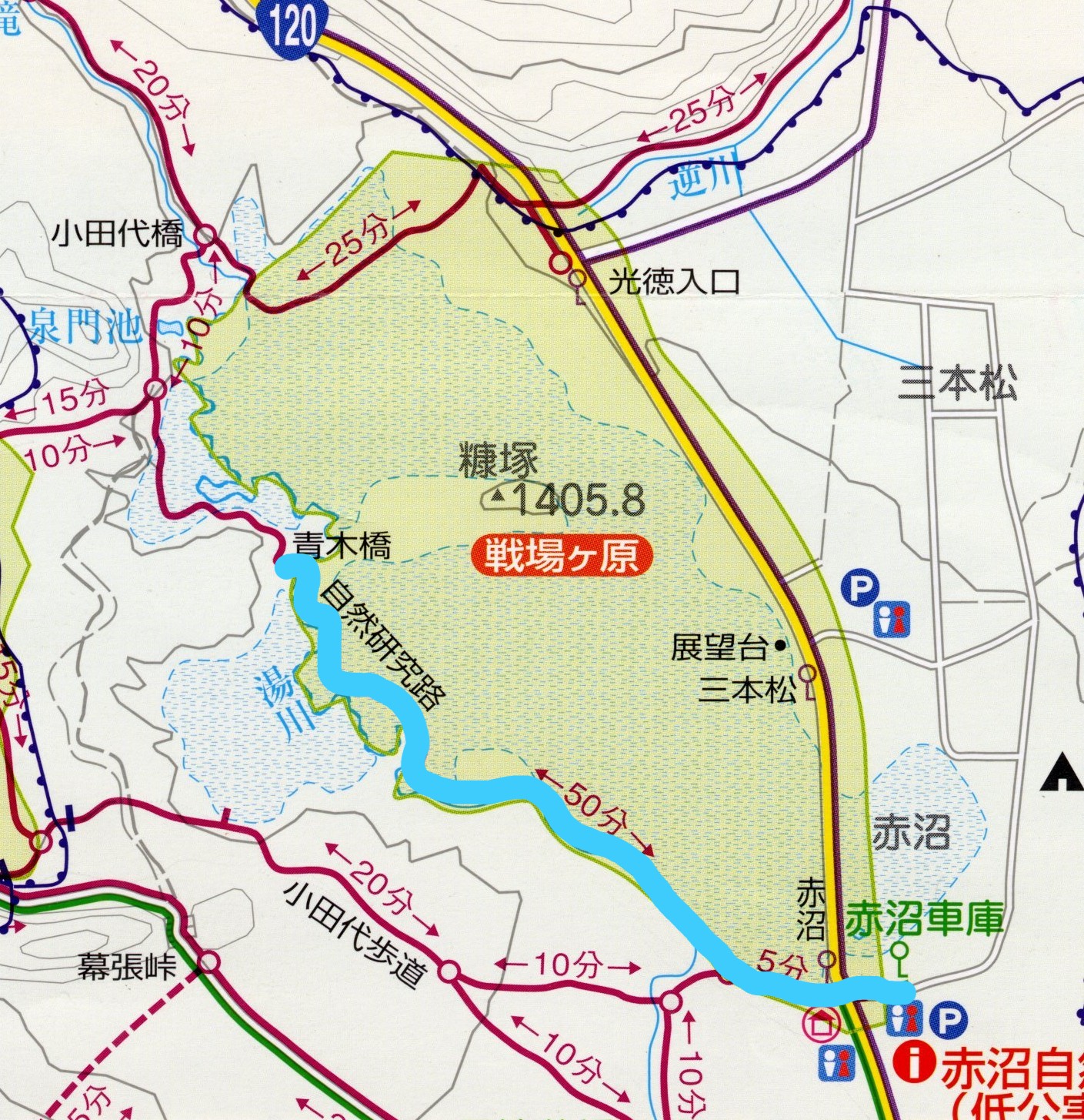 今回は赤沼自然情報センターから戦場ヶ原の遊歩道を通って青木橋まで歩いてきました。距離は往復で3㎞程、大部分は木道で整備されているので歩くのにオススメのコースです。※青線が今回歩いたコースです。